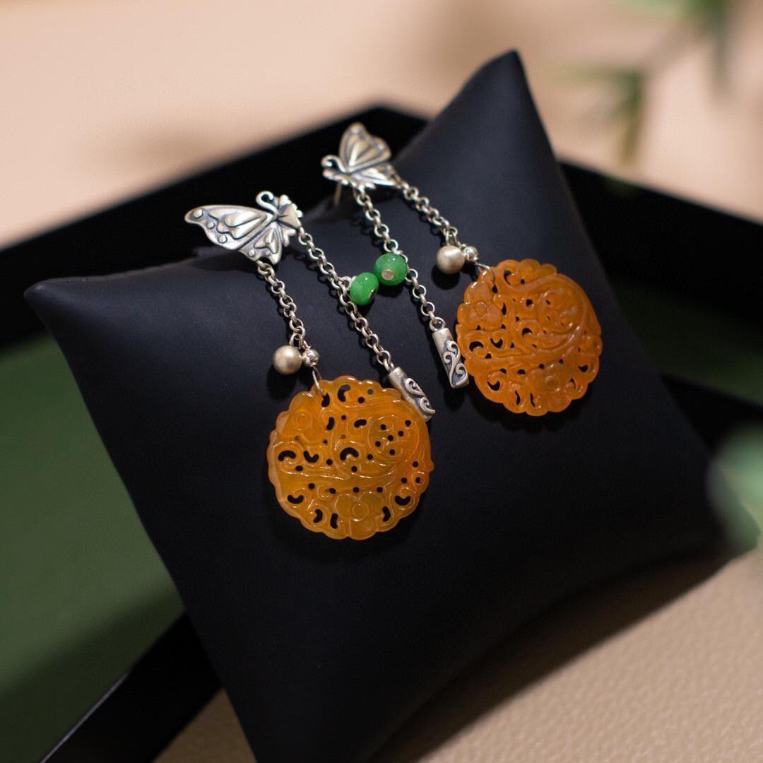S925纯银新品宫廷复古风耳环女古典风流苏蝴蝶耳钉饰品耳饰