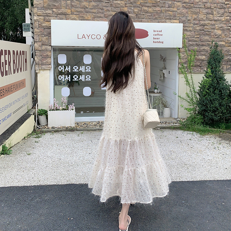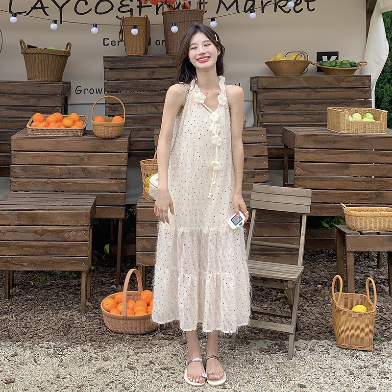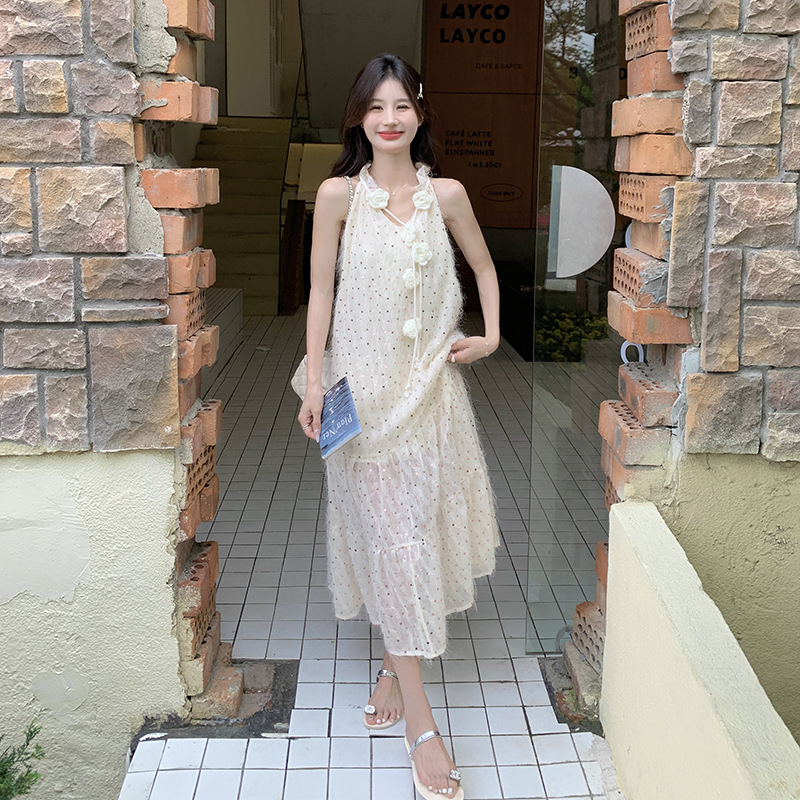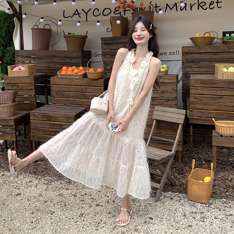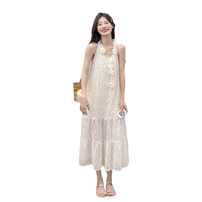实拍法式超仙无袖挂脖连衣裙新款纯色v领气质玫瑰花亮片连衣
