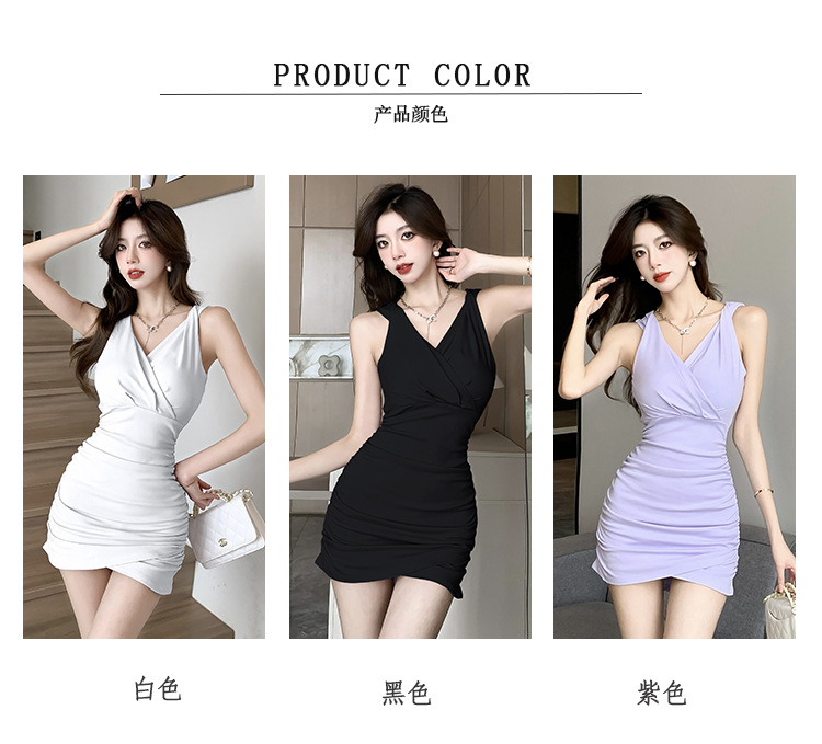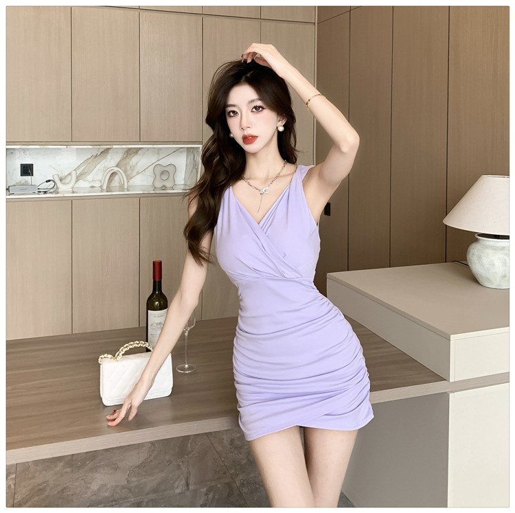 香芋紫交叉吊带连衣裙女夏气质女人味褶皱短裙性感辣妹修身包臀裙