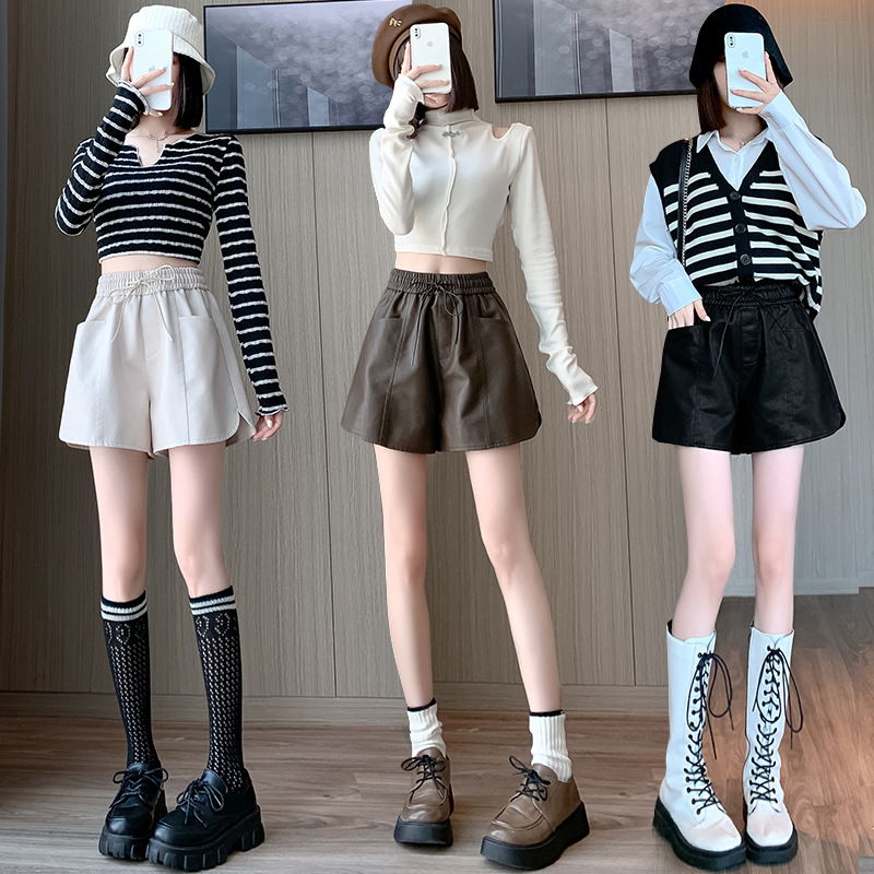 春夏新款pu皮短裤女松紧高腰显瘦阔腿黑色百搭外穿休闲裤