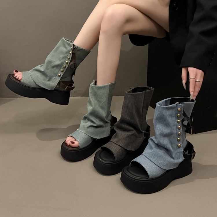 英伦风厚底牛仔布马丁靴女2025新款夏季小众复古透气凉靴粗跟短靴