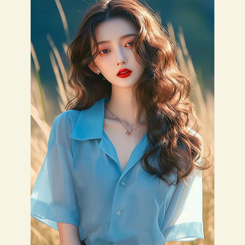 今年流行漂亮小衫法式独特小上衣小众设计蓝色雪纺短袖衬衫女夏季