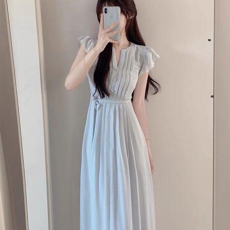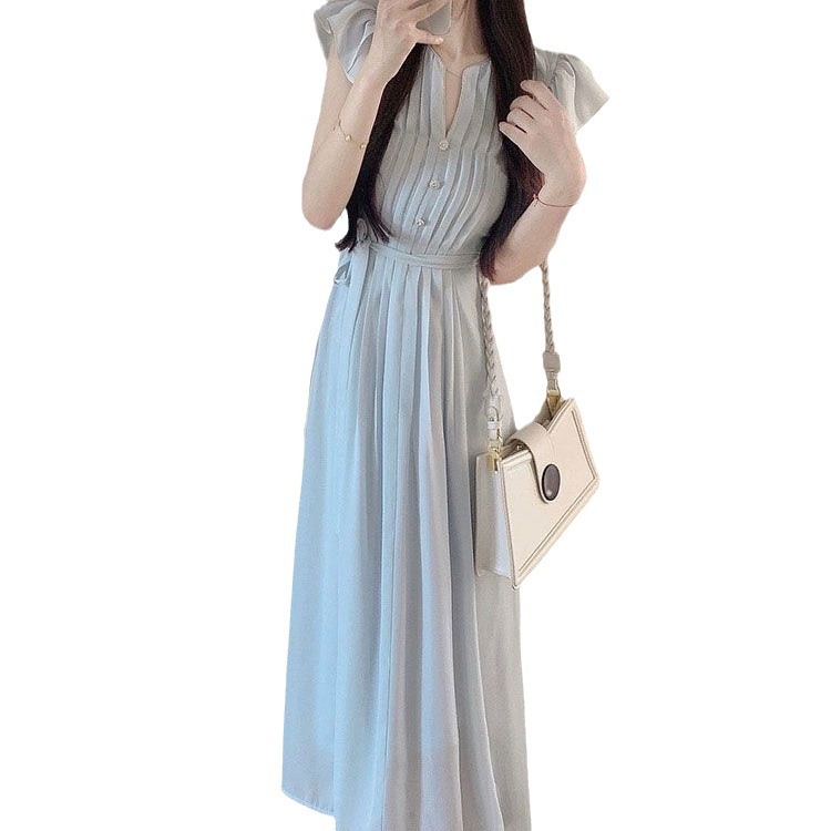 夏季新款法式温柔风修身裙子显瘦垂坠感小飞袖宽松连衣裙女