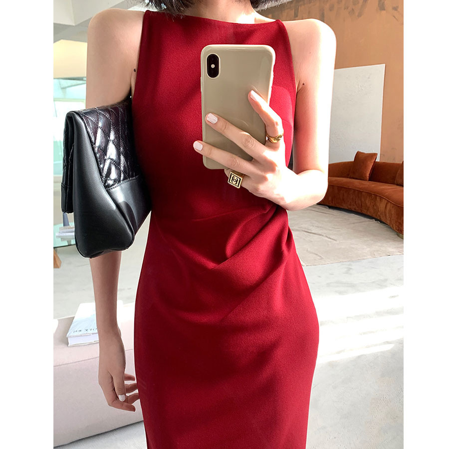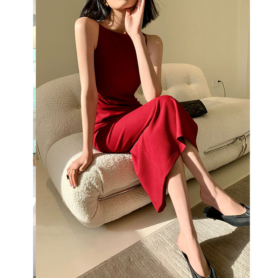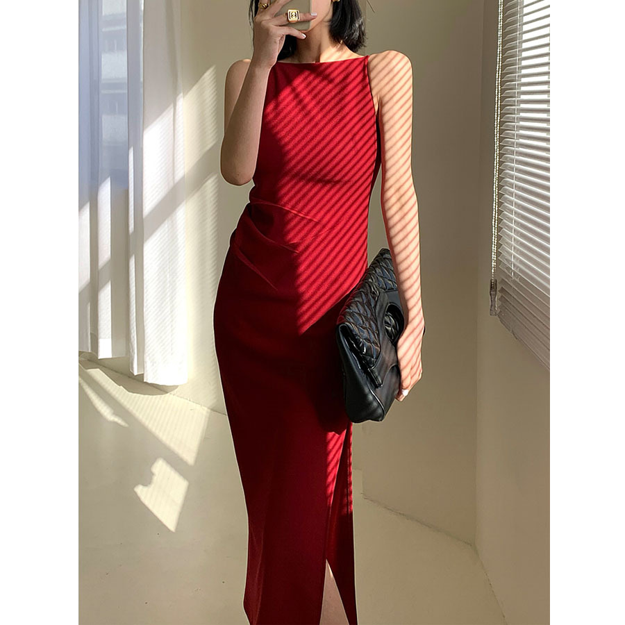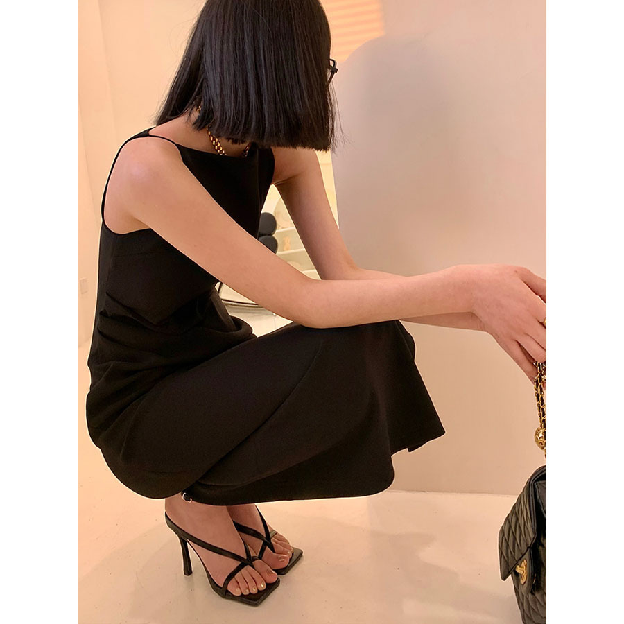 吊带连衣裙夏季新款轻奢一字肩高级设计感无袖开叉长裙