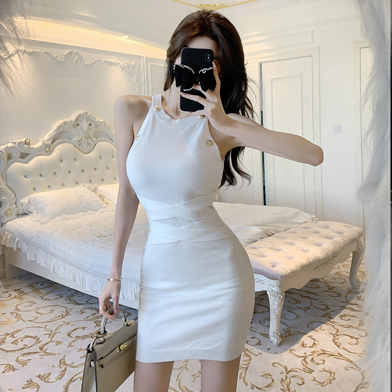 纯欲风挂脖排扣连衣裙女夏季性感修身收腰辣妹包臀裙甜美背心短裙