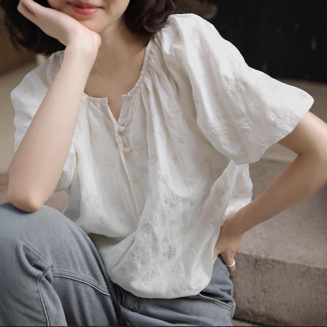 法式精美钩花90%凉感天丝灯笼袖短袖雪纺衫上衣女夏