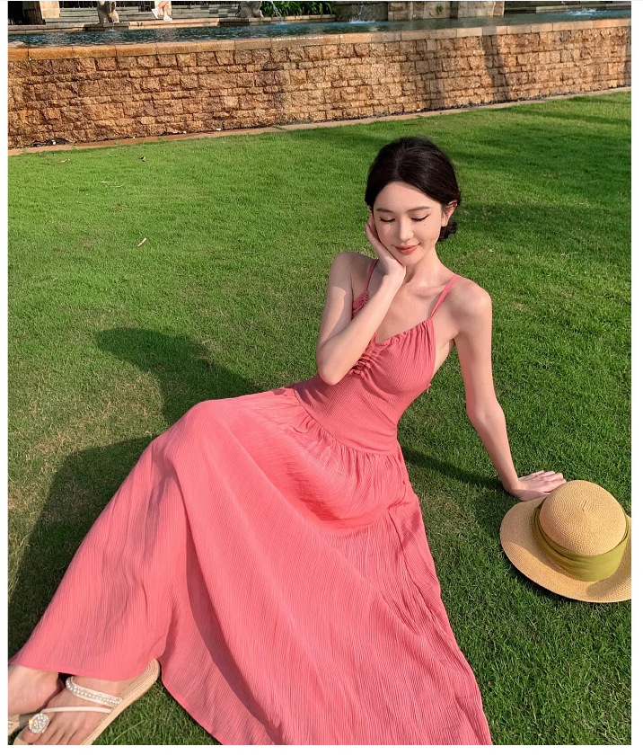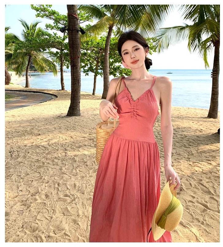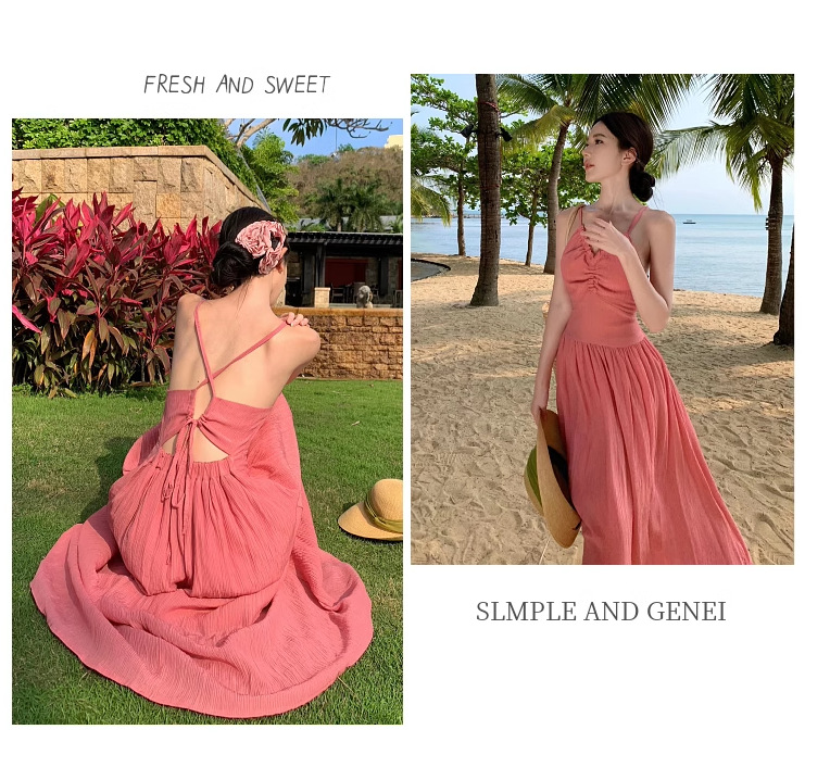 性感时尚露背收腰吊带连衣裙甜美度假风显身材显高超修身长裙