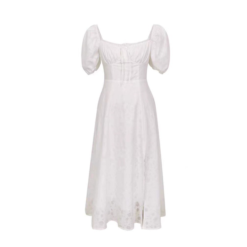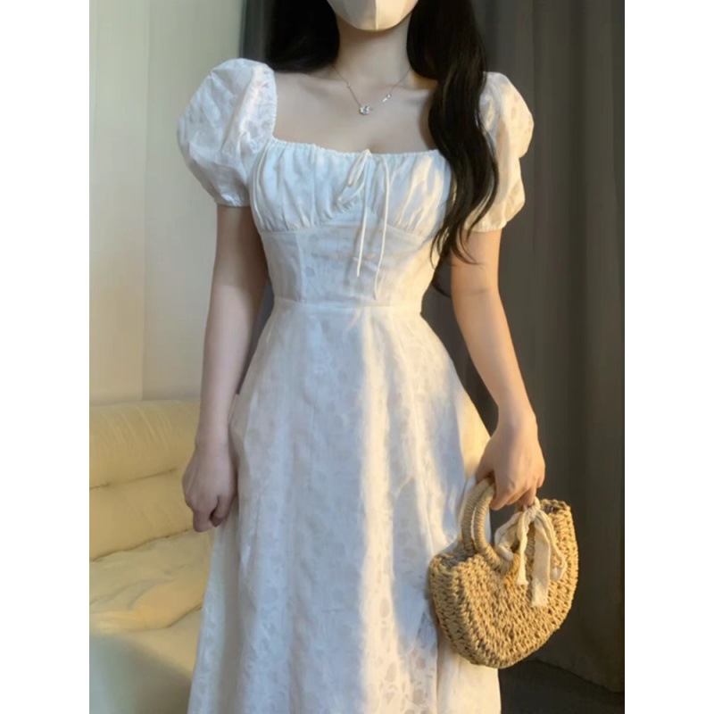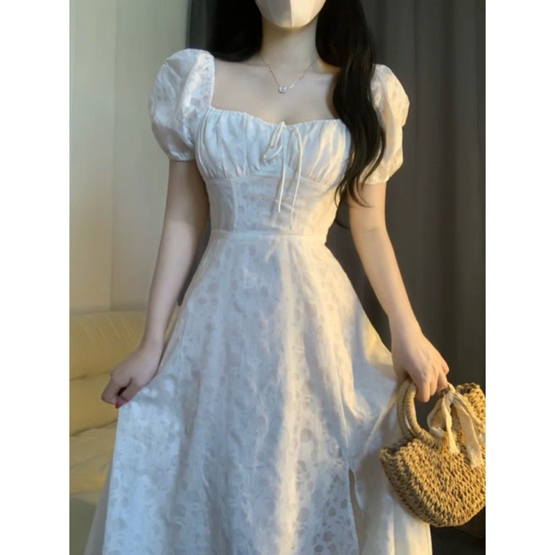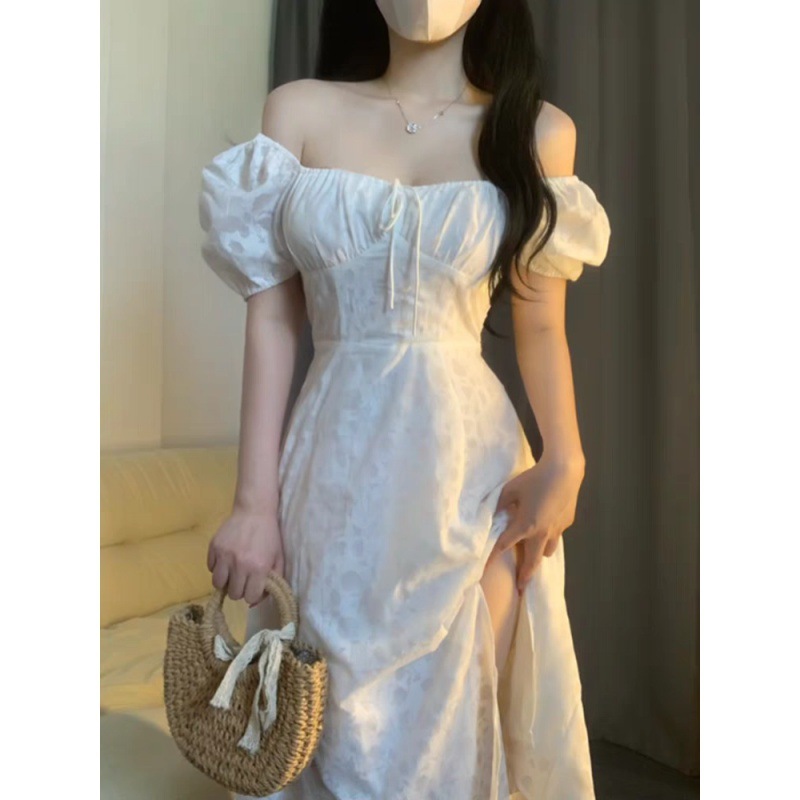 法式初恋泡泡袖连衣裙女年夏季高级感气质收腰一字肩开叉长裙