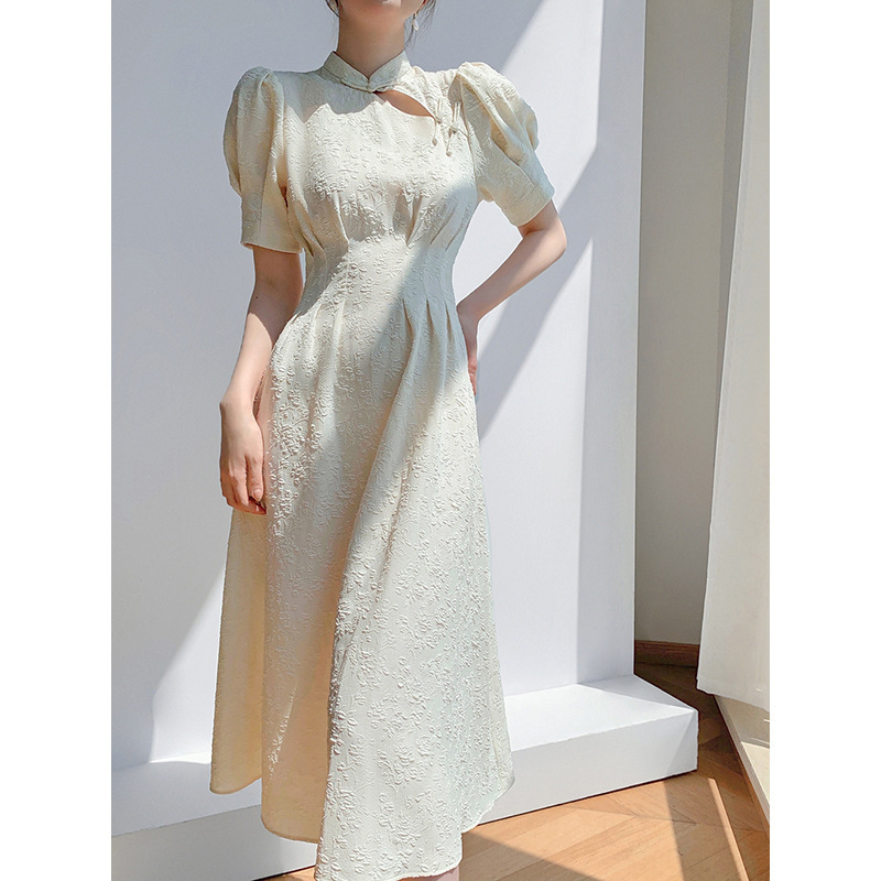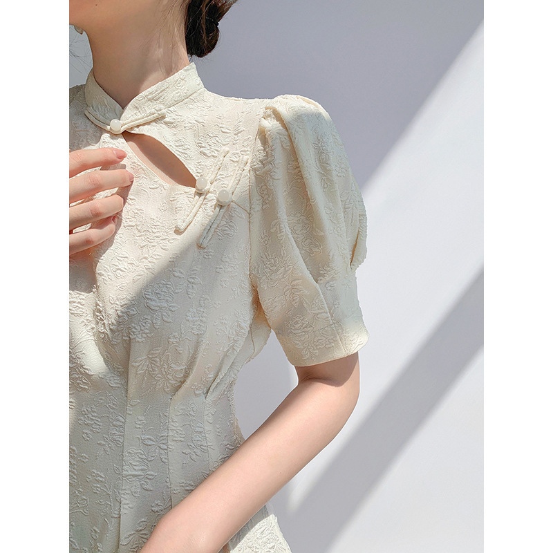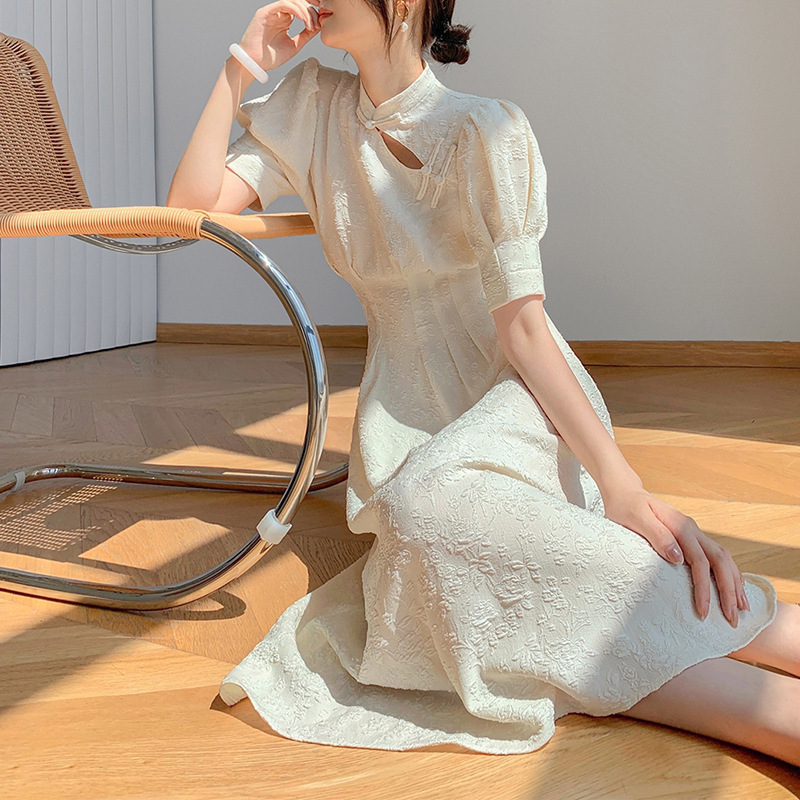 复古改良白色旗袍裙女夏季新款法式高级感提花连衣裙女长裙