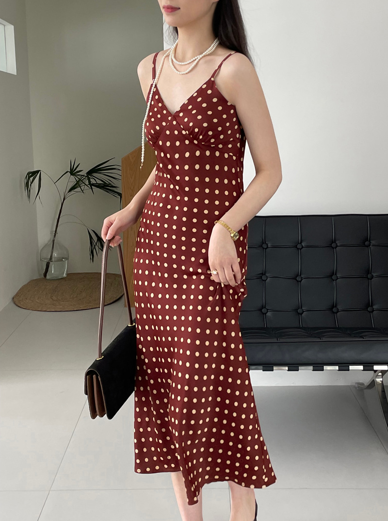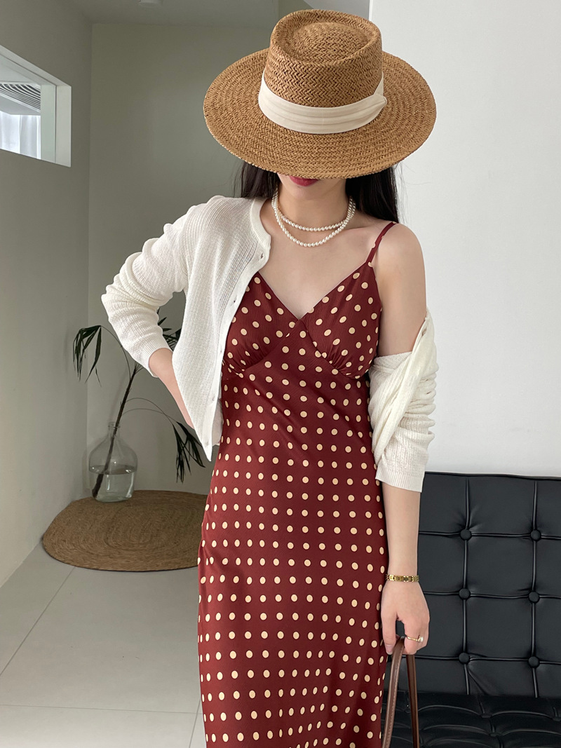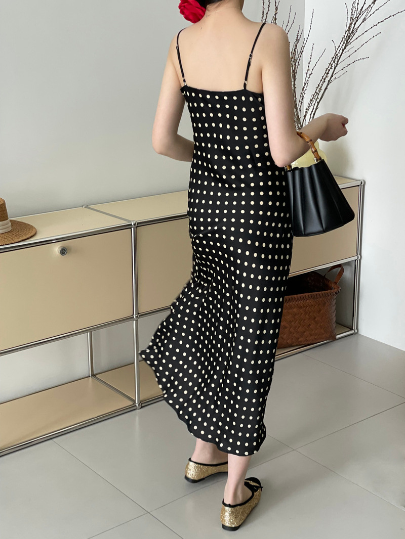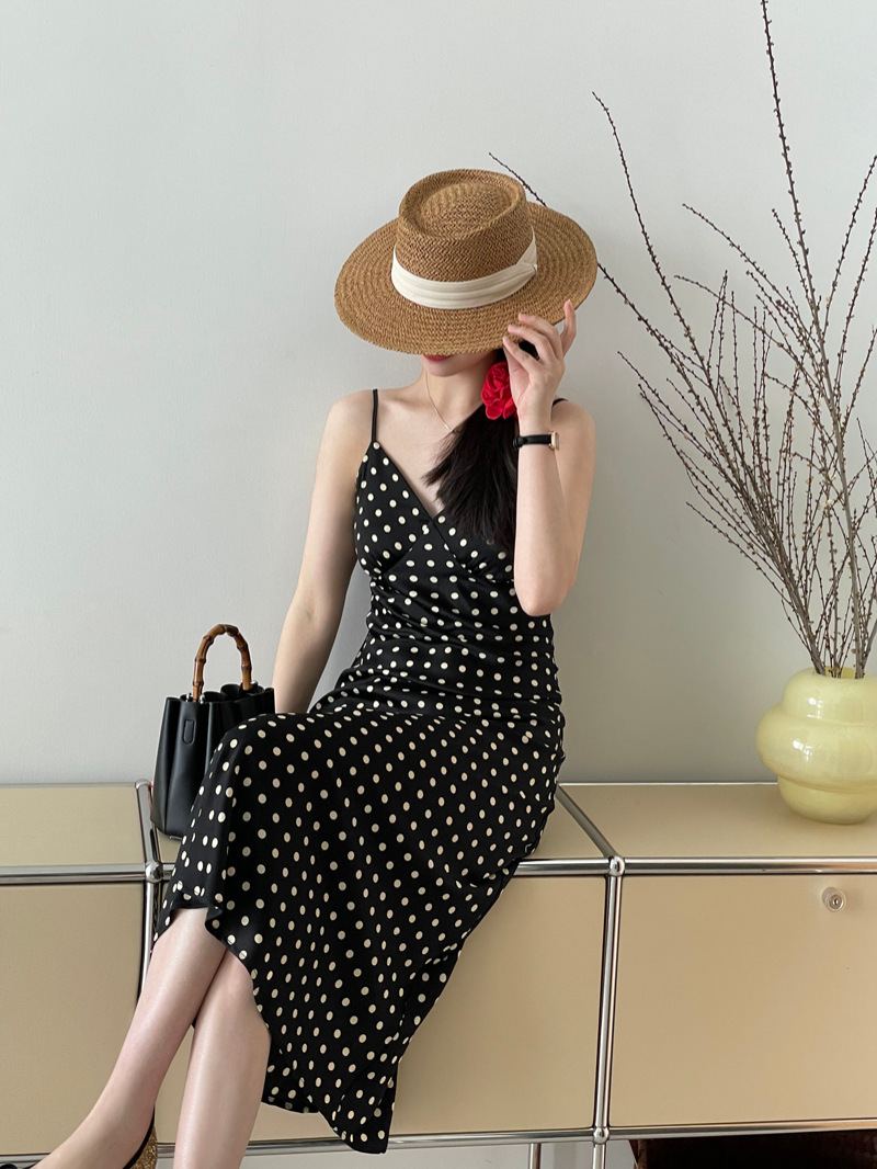 复古港风波点吊带裙女度假风修身显瘦连衣裙