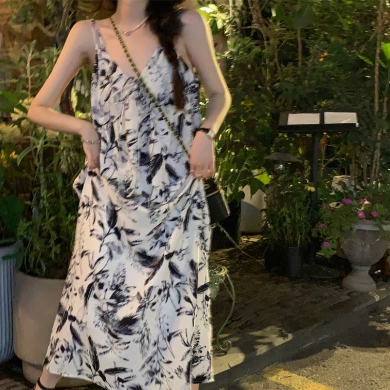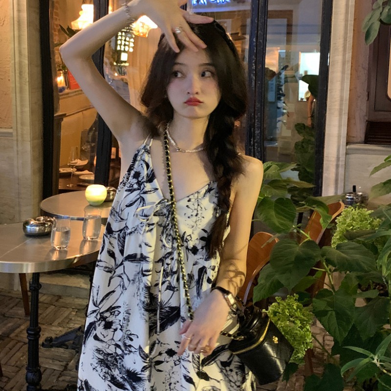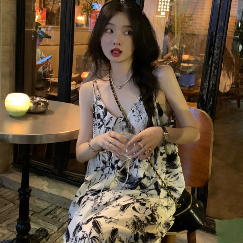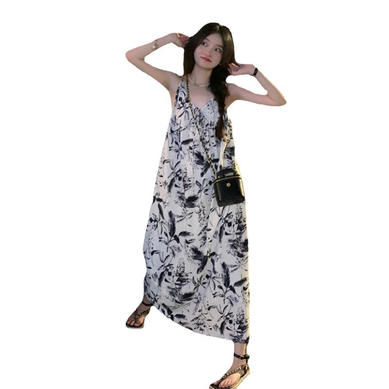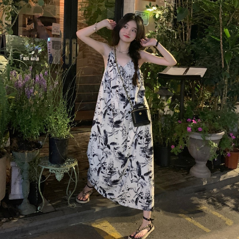 水墨印花v领吊带连衣裙夏季女法式小众宽松慵懒风过膝长款碎花裙