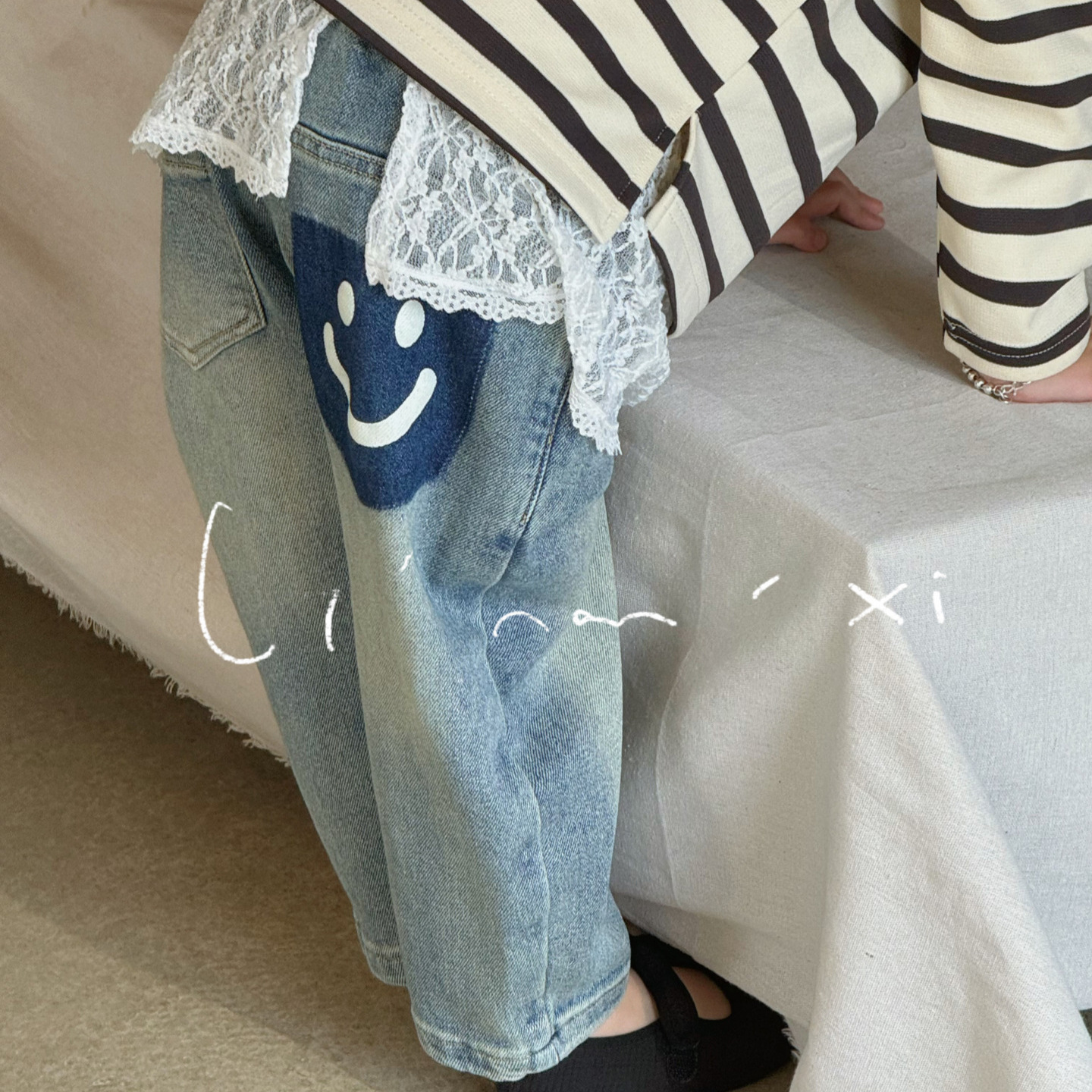 24春新品儿童笑脸牛仔裤男女童复古色做旧软牛仔宝宝印花休闲长裤
