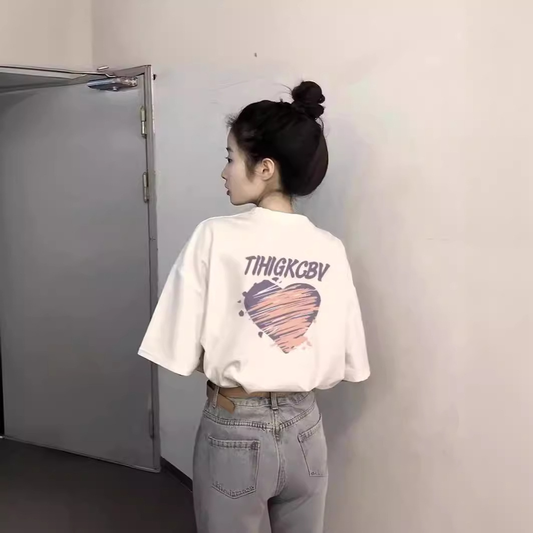 韩版宽松纯棉重磅t恤女短袖设计感小众卡通印花百搭圆领上衣夏季