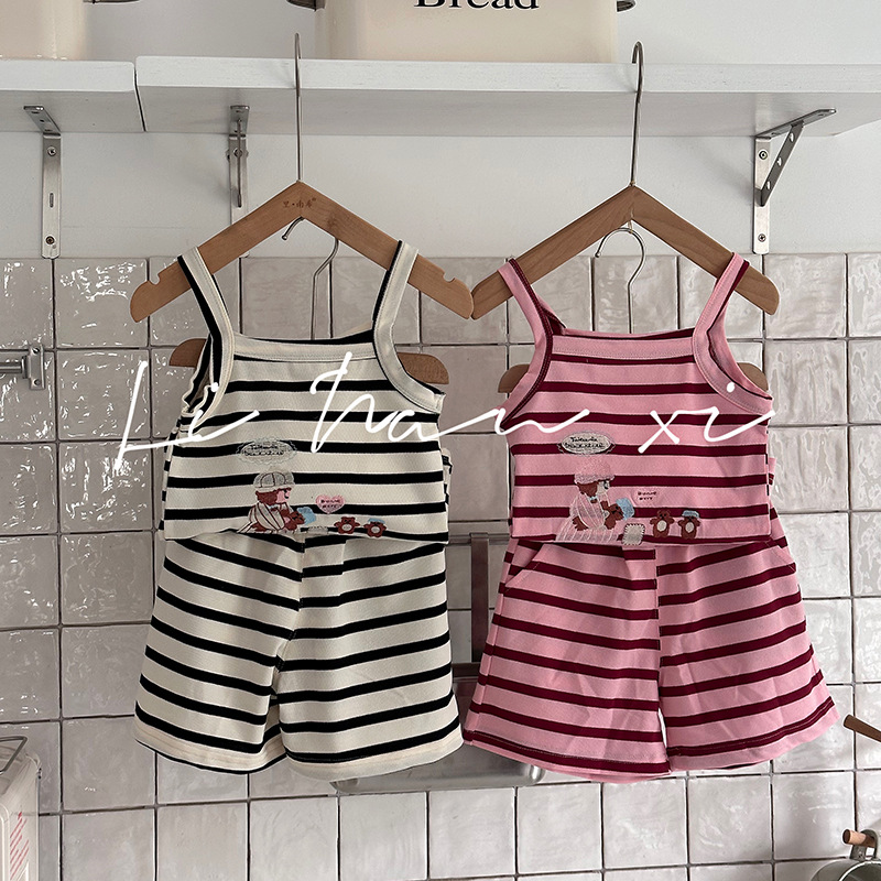 24夏新款儿童套装色织针织条纹女童两件套3-8岁宝宝吊带T短裤套装