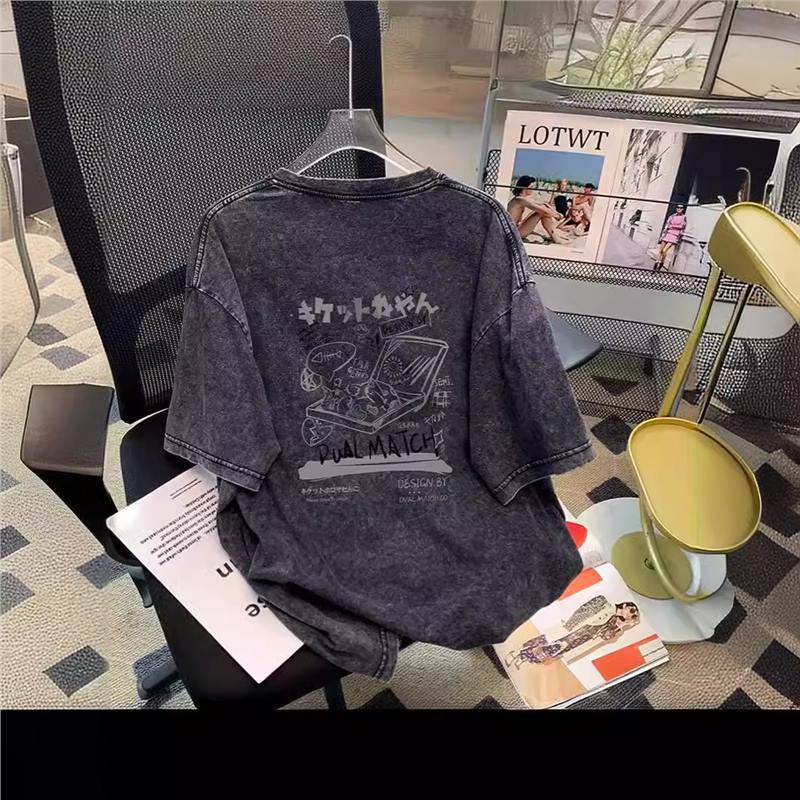 美式复古做旧水洗短袖T恤男女夏胖mm潮牌街头嘻哈印花情侣体恤衫
