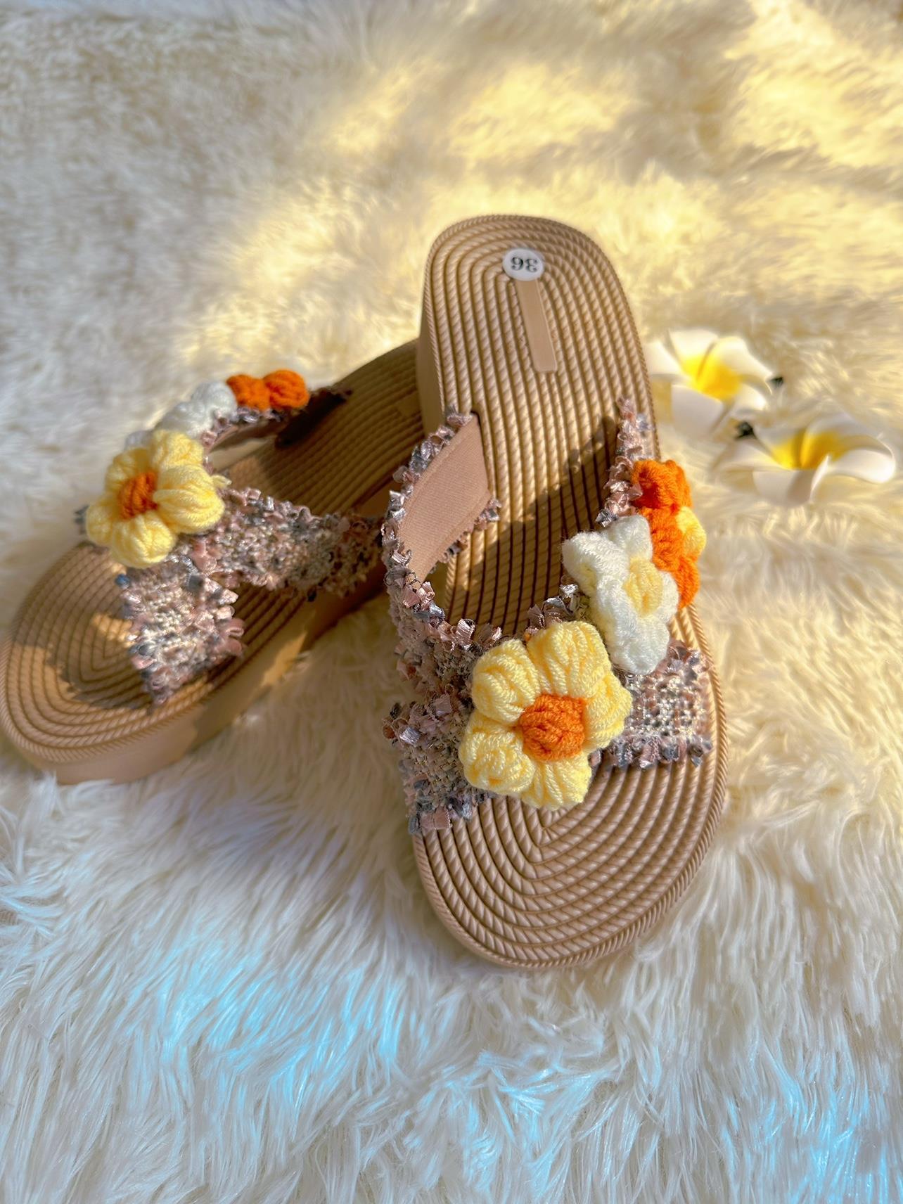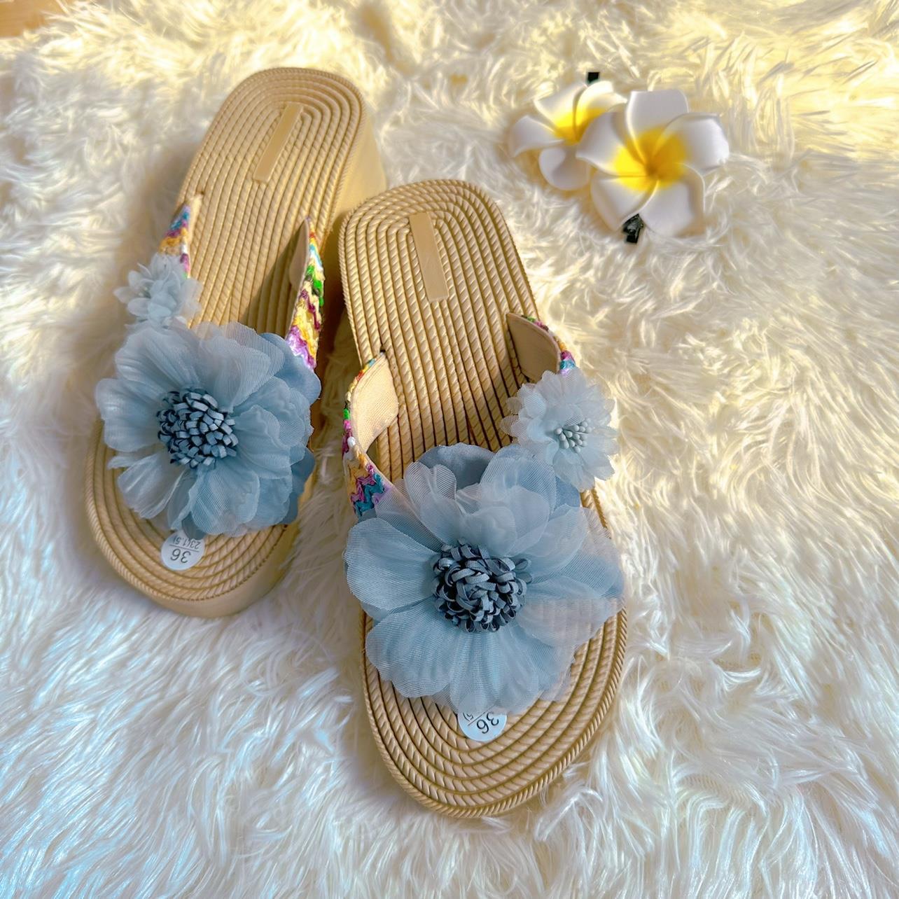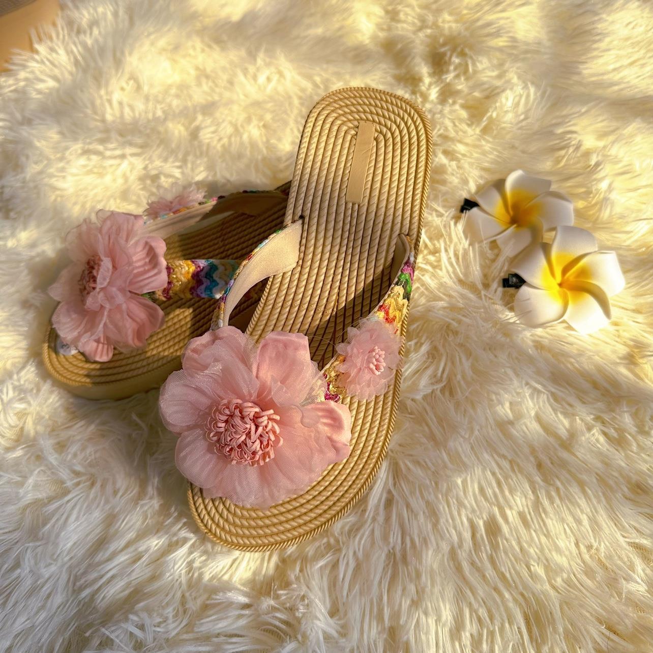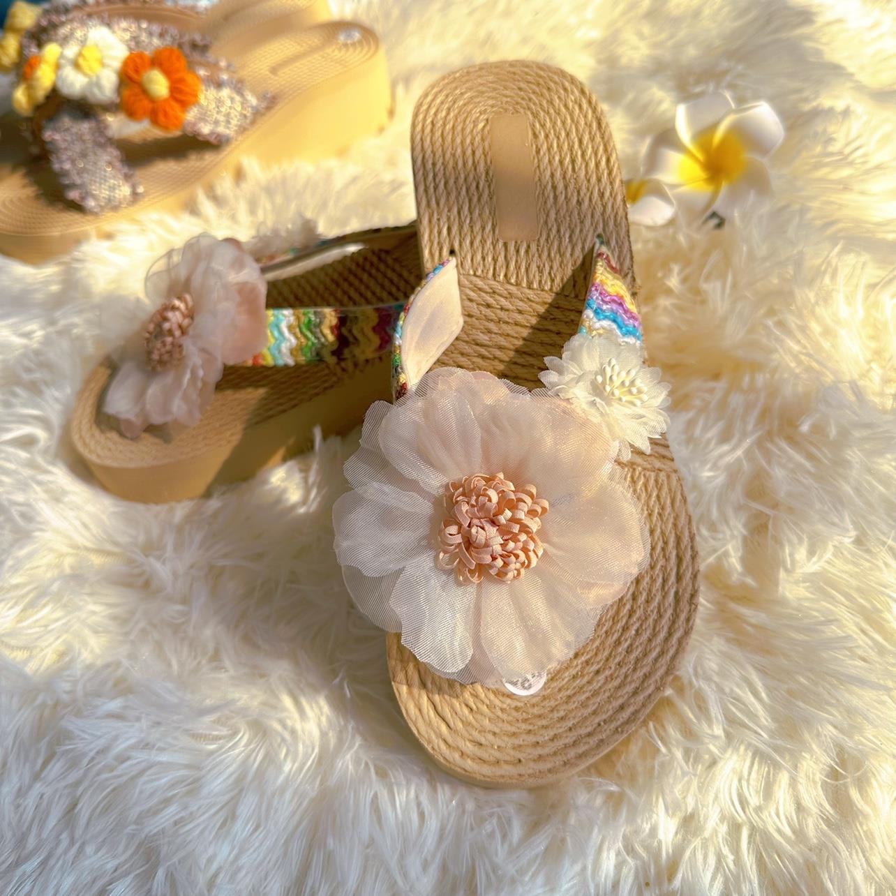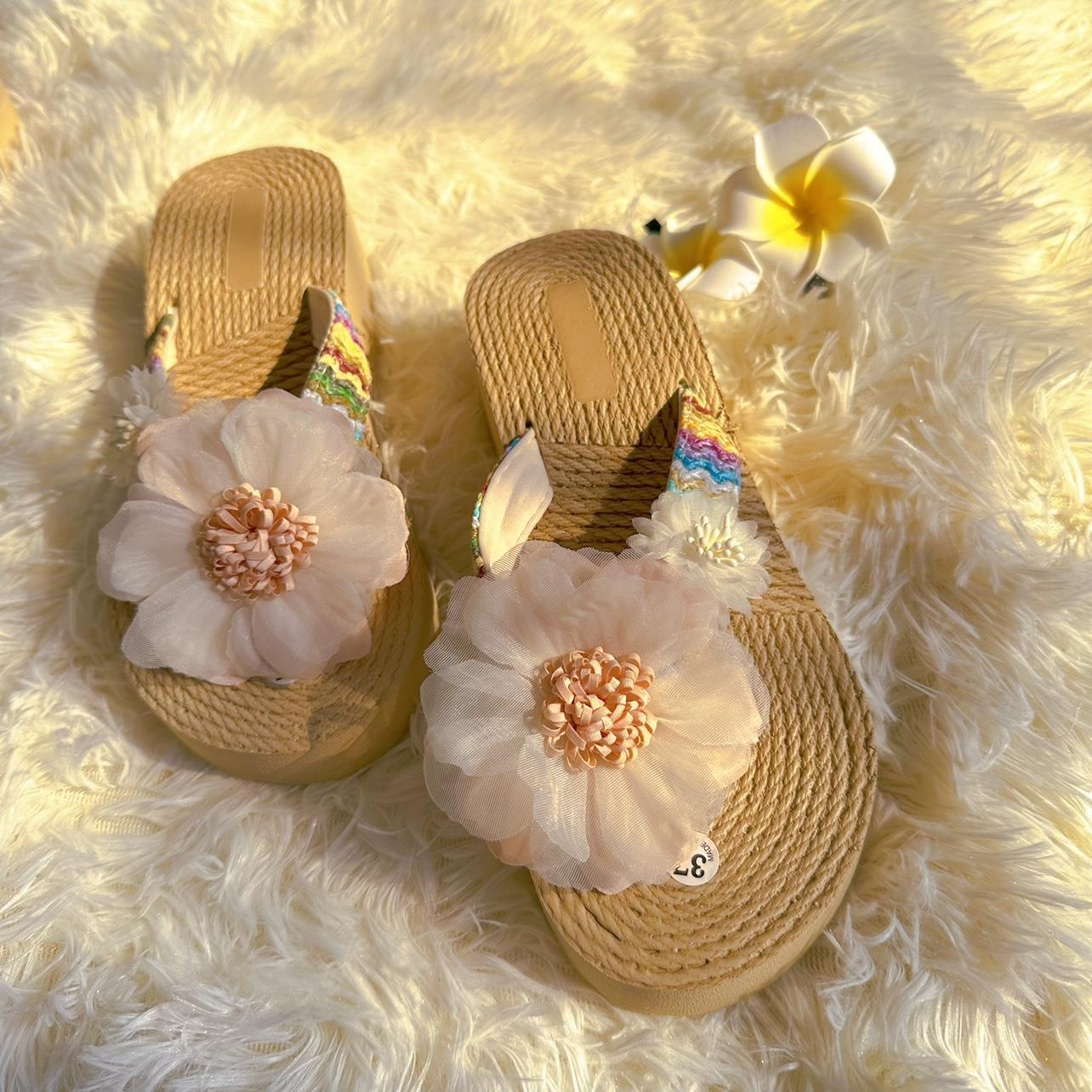 新款仙女风坡跟人字拖女夏季时尚草编花朵厚底傣族鞋沙滩鞋凉鞋