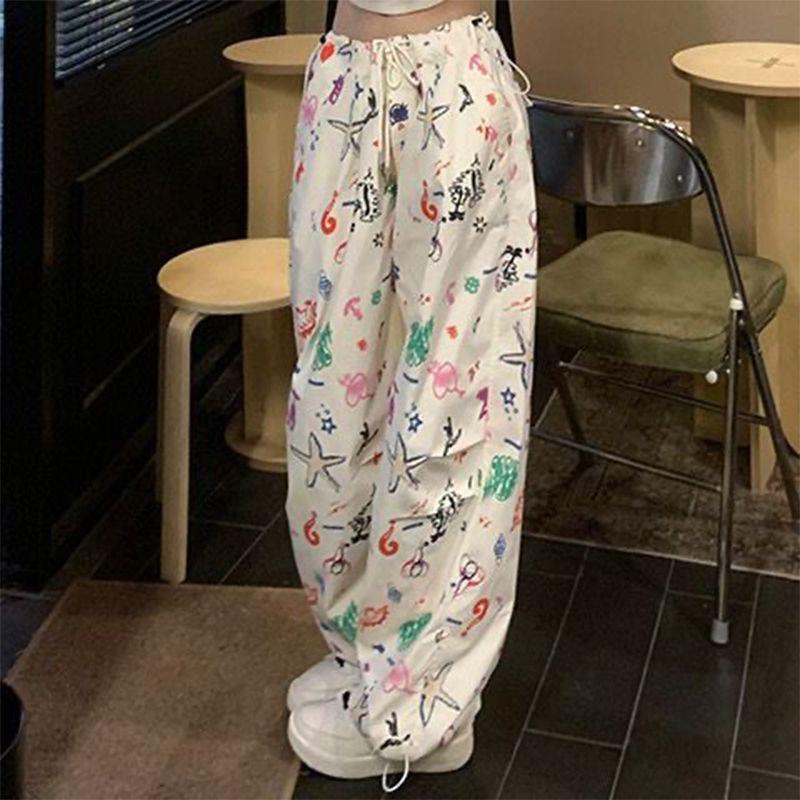 夏季高腰显瘦美式复古hiphop趣味涂鸦满印工装裤子女宽松束脚长裤
