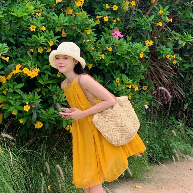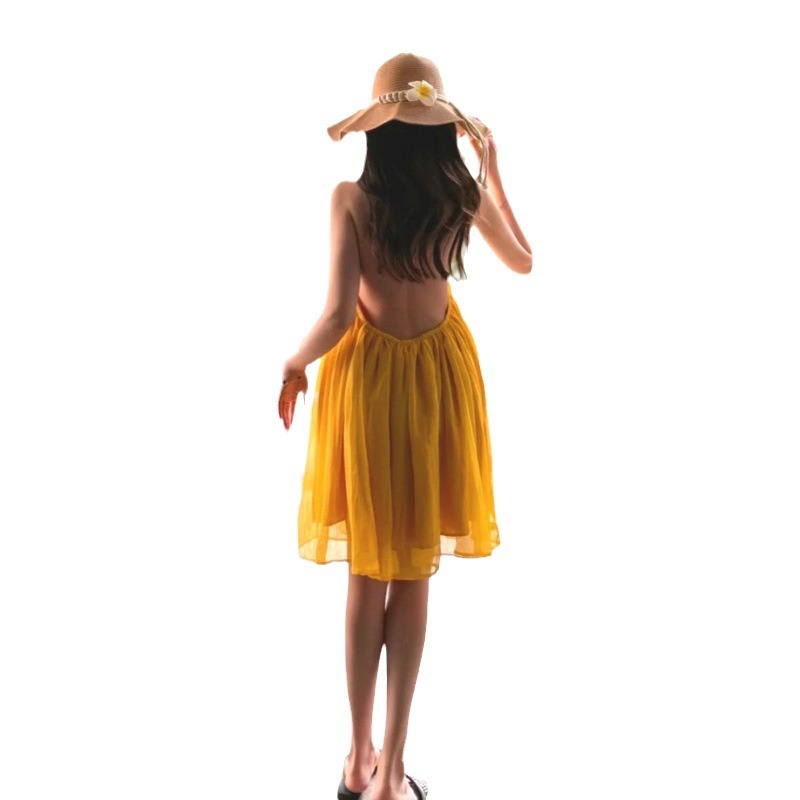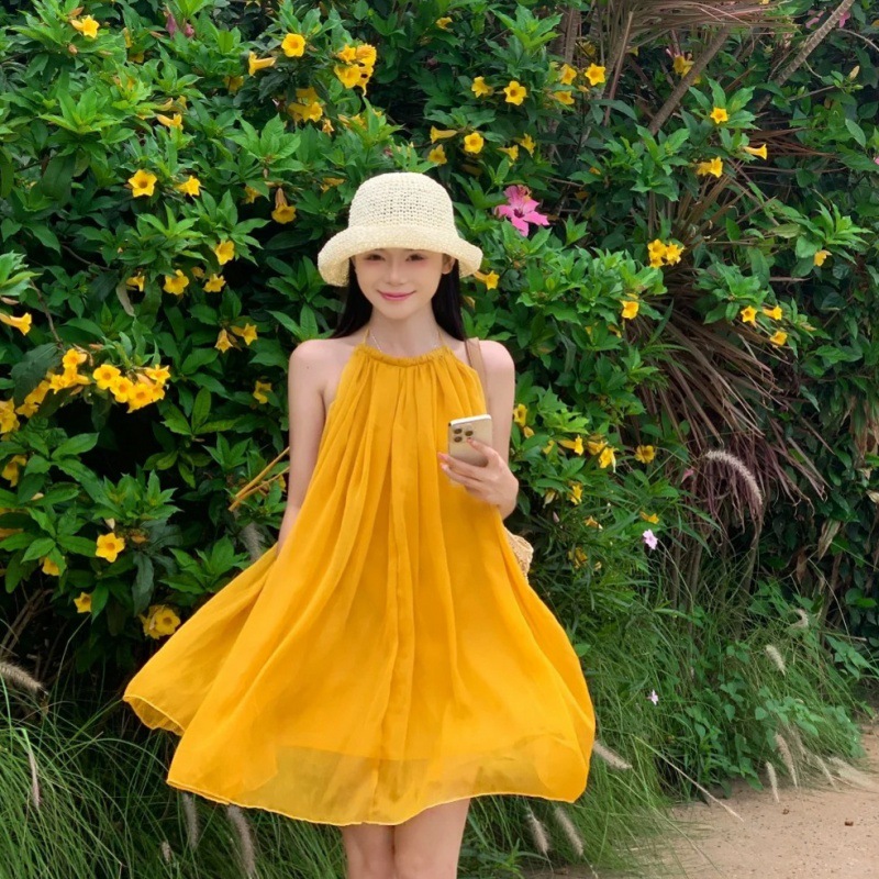 夏季新款漂亮法式气质欧货高级感度假风黄色露背吊带连衣裙女