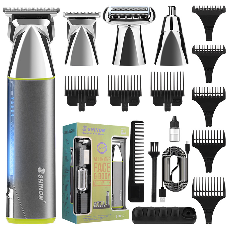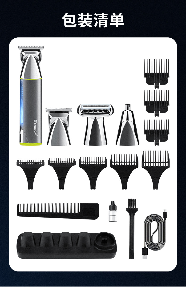 产品配件:主机+理发刀头+雕刻刀头+鼻毛修剪器+鬓角刀头+刮胡刀头+体毛刀头+英文说明书+type-c充电线+清洁刷+梳子+围布+收纳包+限位梳*8(1.5 3 6 9).
