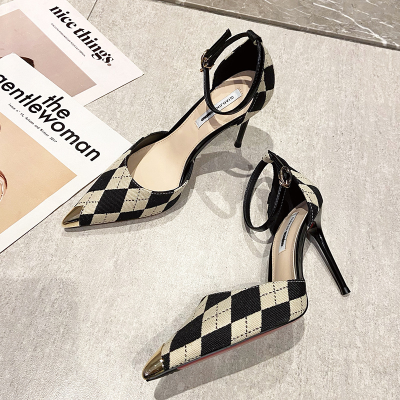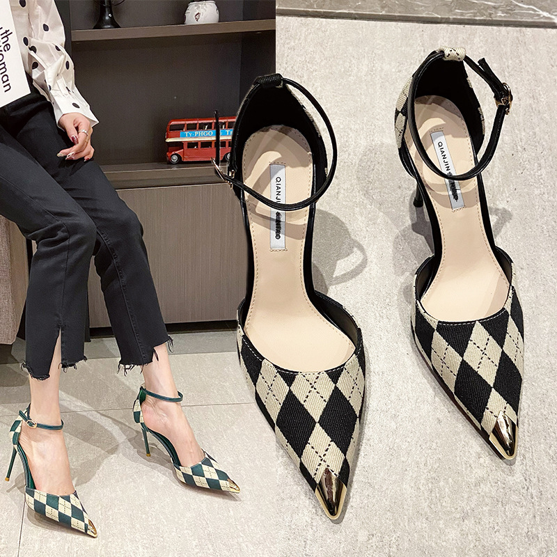 一字扣高跟鞋春夏新款欧美格子尖头浅口性感细跟搭扣中空凉鞋