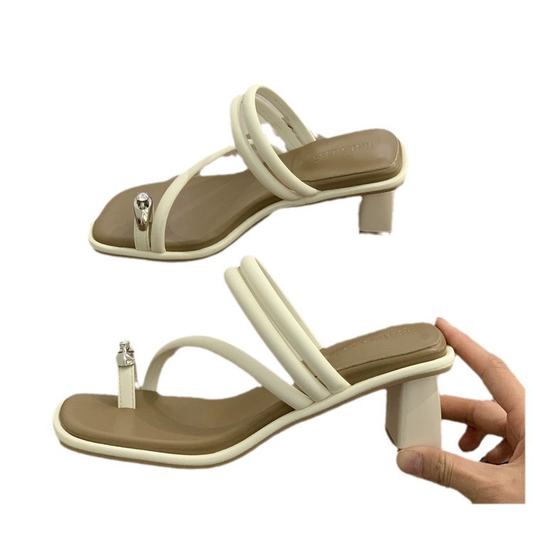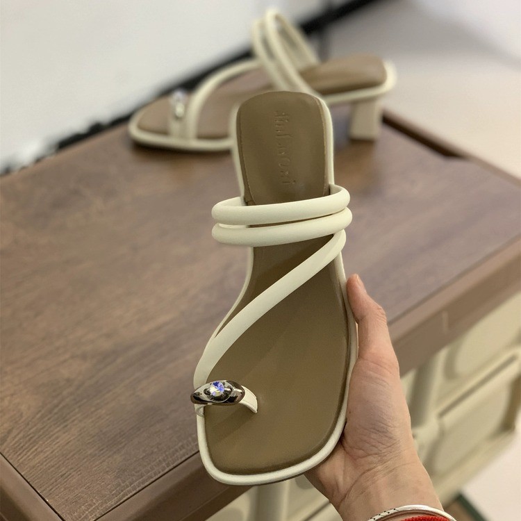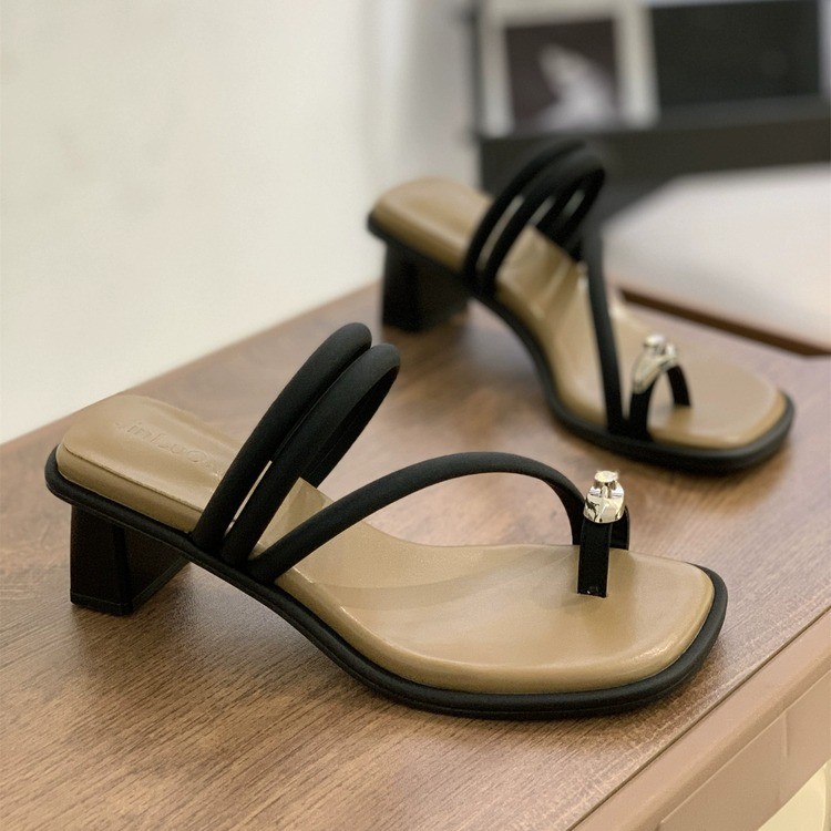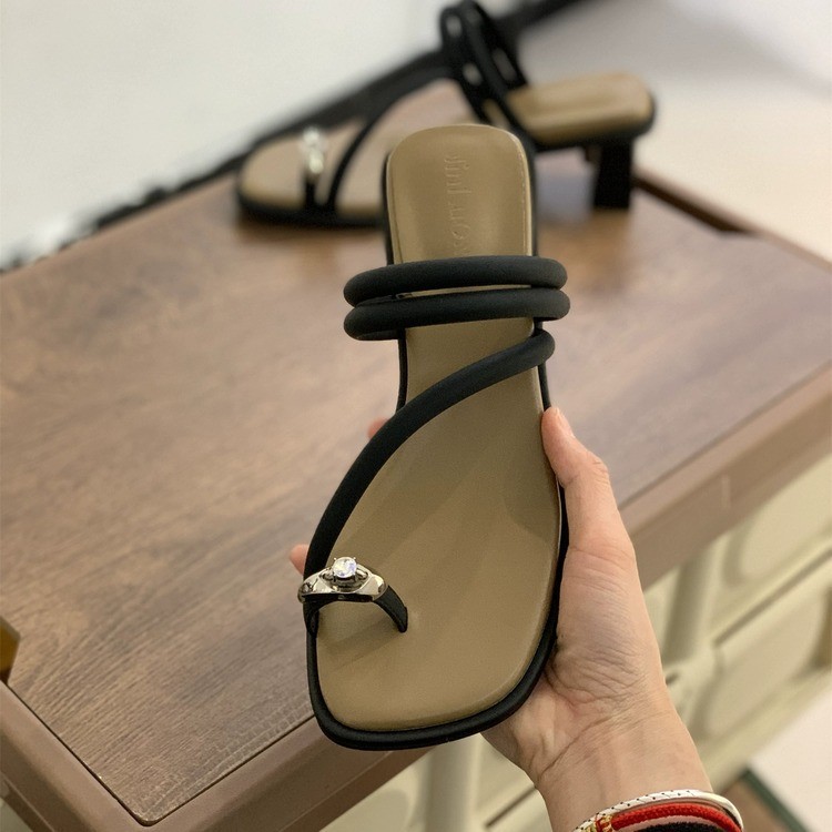 套趾凉拖鞋女外穿春新款法式中跟凉鞋花朵水钻粗跟凉拖鞋大码