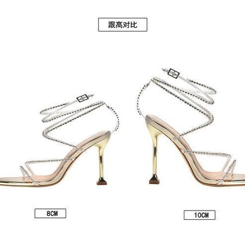 夏季新款方头水钻凉鞋细跟露趾高跟鞋水晶性感一字带罗马鞋女
