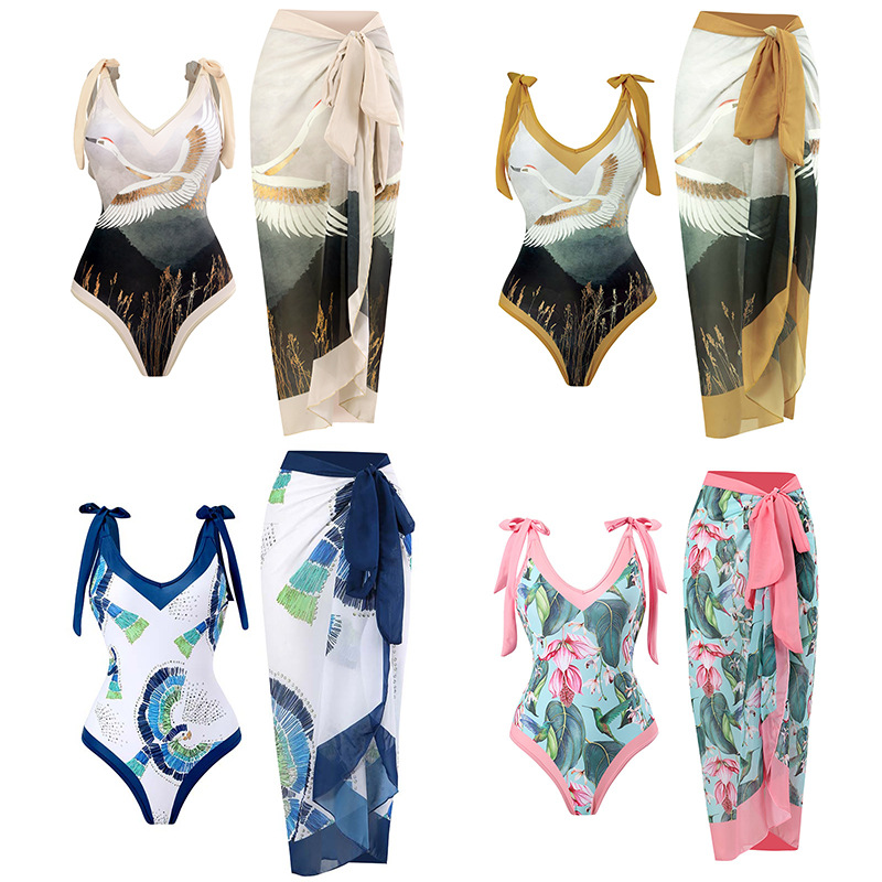【欧美沙滩度假风泳衣女】连体多色防晒纱裙套装亚马逊温泉游泳装