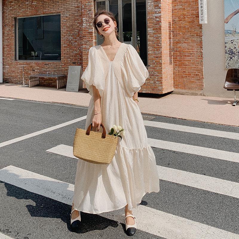 实拍法式V领拼接泡泡袖轻复古感ins宽松大裙摆显瘦杏色连衣裙
