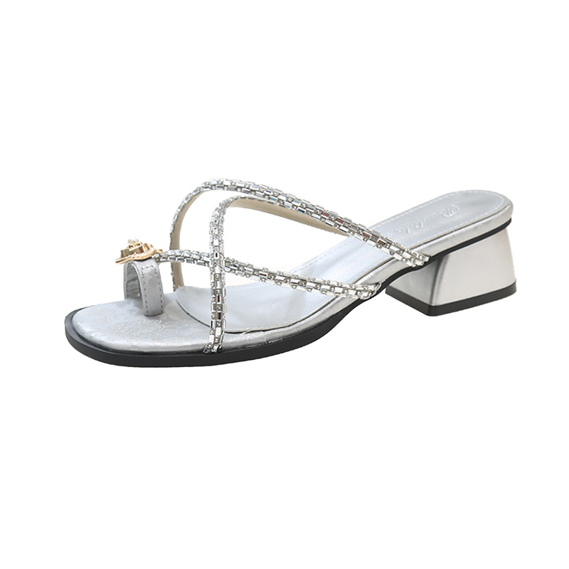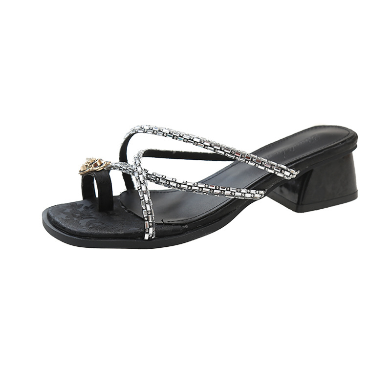 法式粗跟拖鞋女外穿夏新款花朵水钻凉拖鞋百搭夹趾罗马凉鞋
