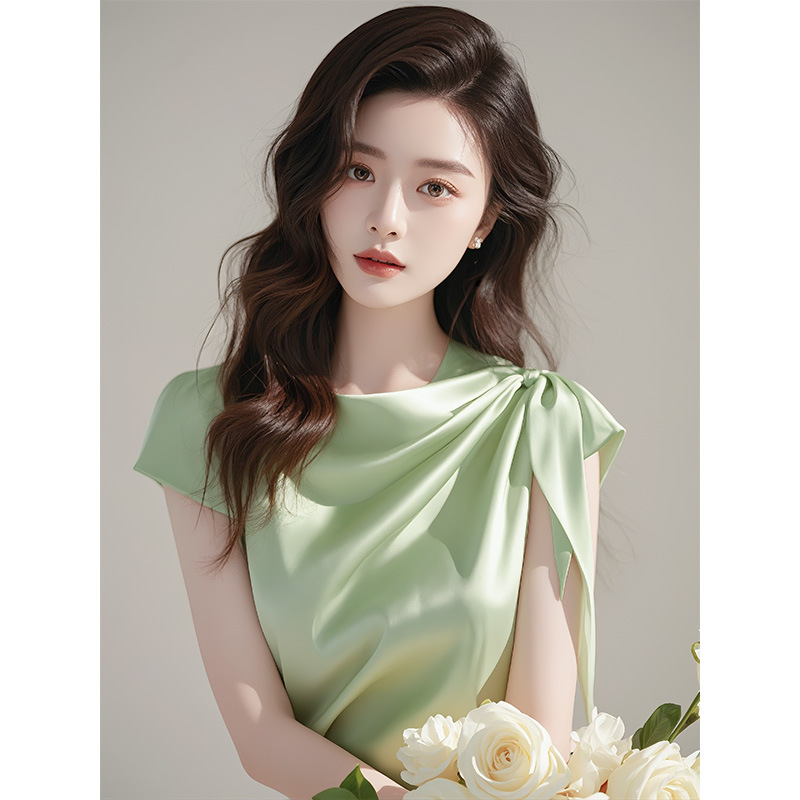 夏季独特漂亮绿色荡领衬衫女洋气高端轻熟法式小众绝美小上衣
