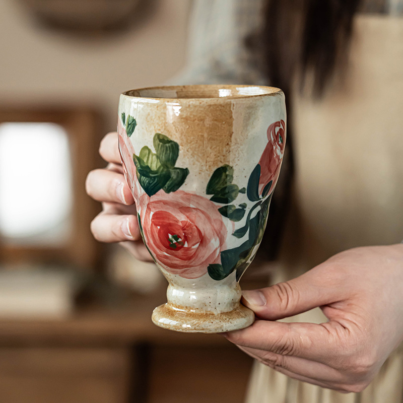 手绘粗陶无把杯复古杯子批发日式陶瓷高脚杯家用水杯餐厅茶杯酒杯