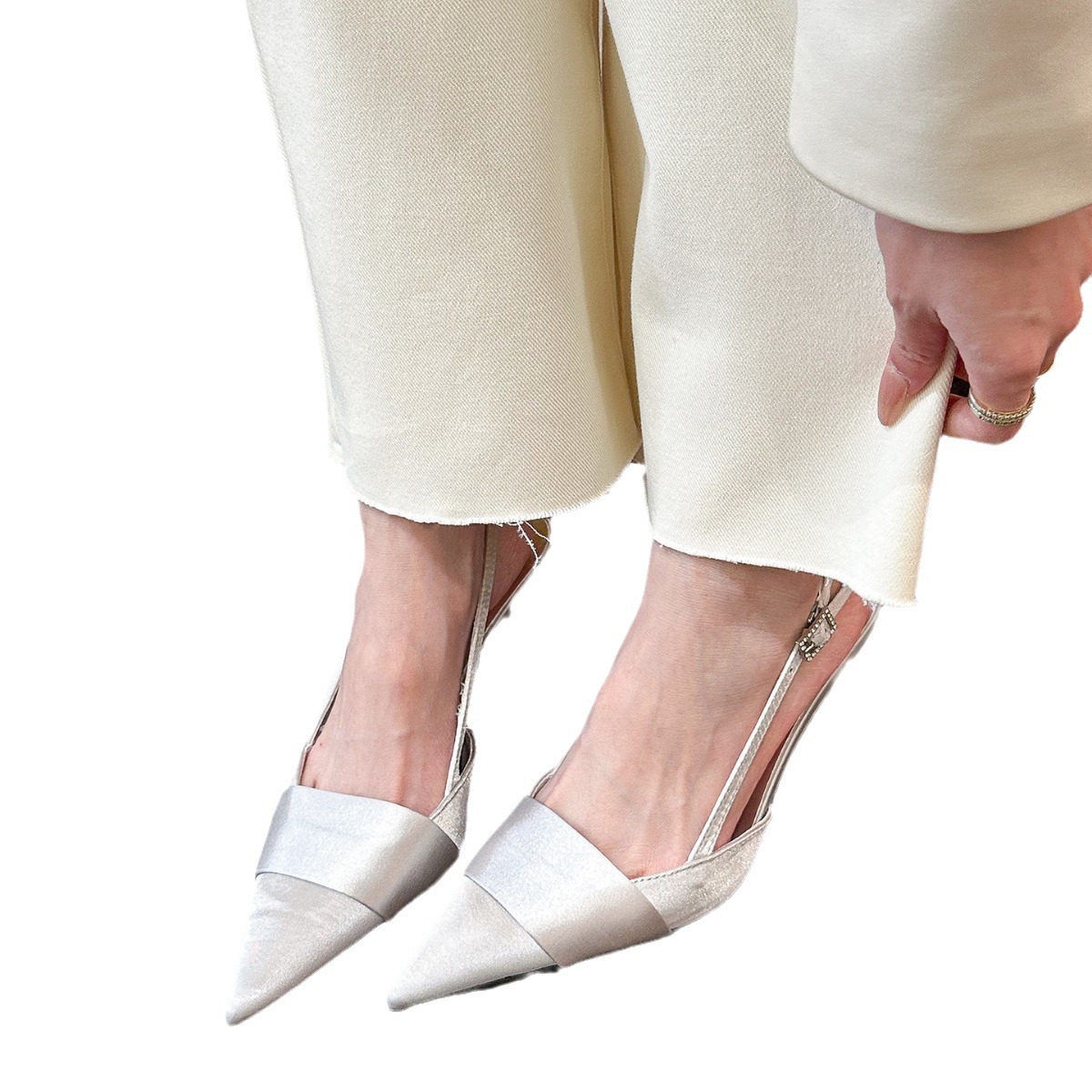 气质小众新款清冷感!尖头银色绸缎凉鞋女包头后空细跟高跟鞋
