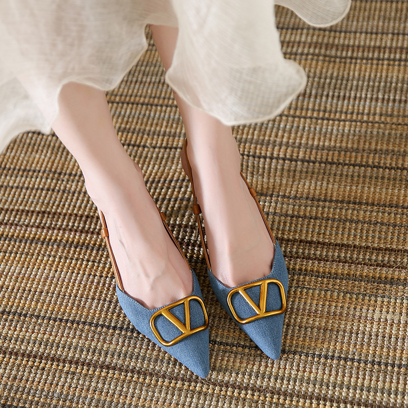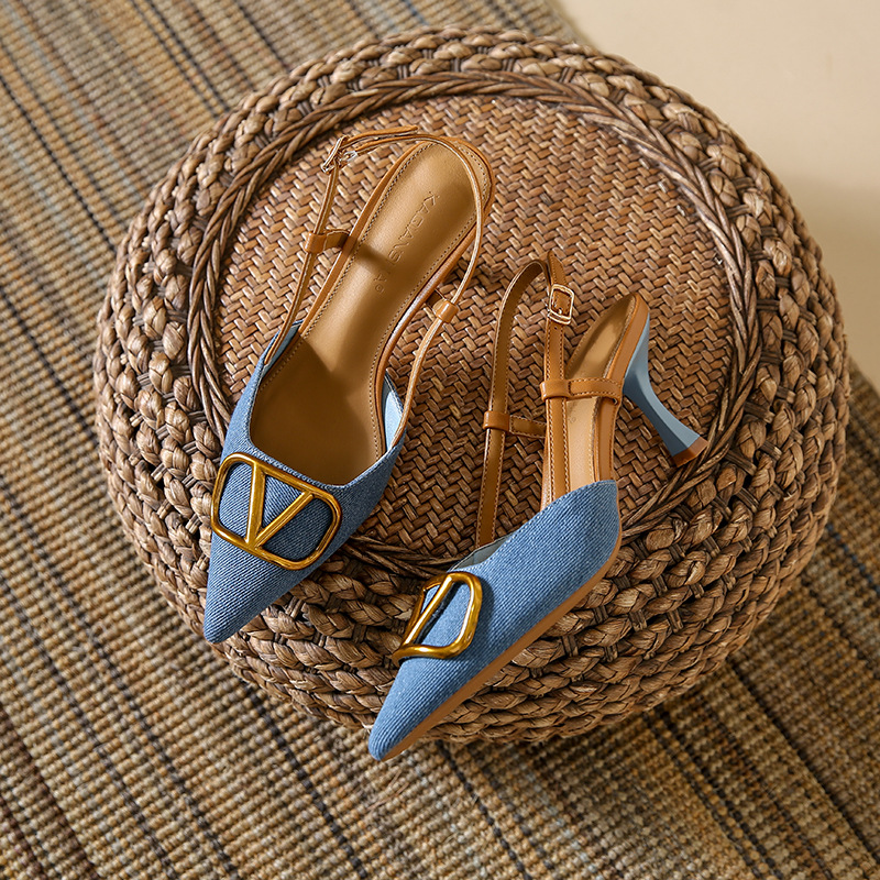 包头凉鞋女夏新款7cm细跟时尚性感V扣尖头不累脚外穿牛仔布高跟鞋