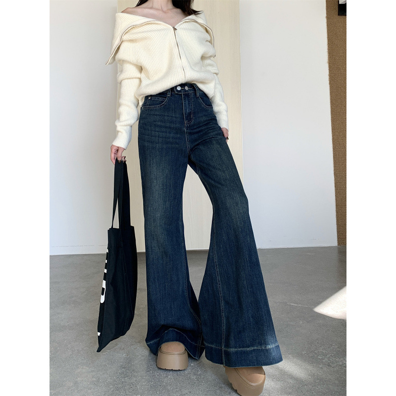 复古辣妹高腰弹力阔腿大裤脚喇叭拖地裤牛仔长裤女