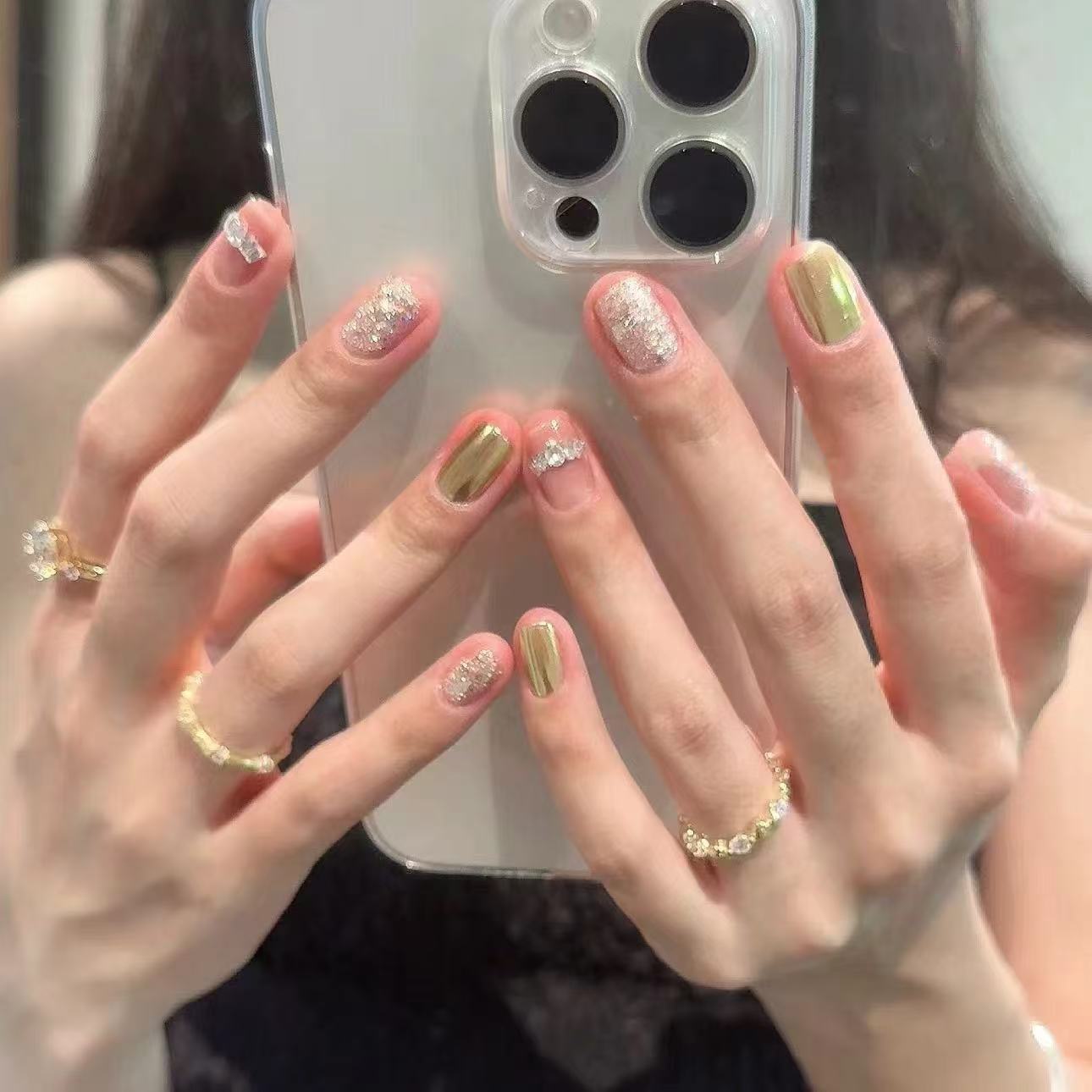 手工穿戴甲高级感爆闪绿色魔镜粉轻奢超闪水晶钻亮片甜美少女美甲