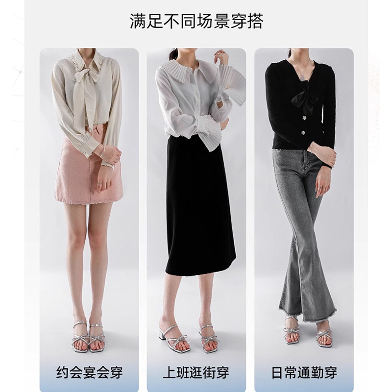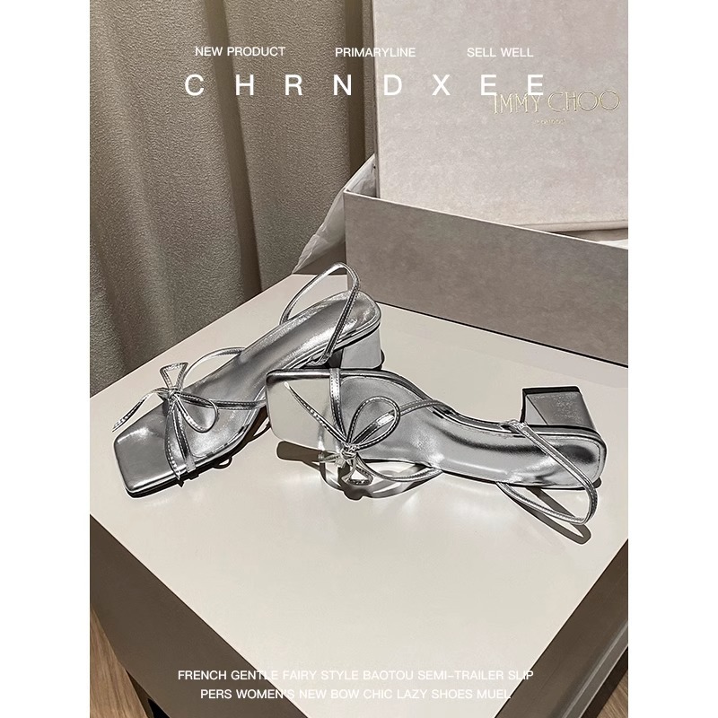 鹿季绝美银色凉鞋粗跟蝴蝶结方头后绊带高跟鞋夏气质百搭凉鞋