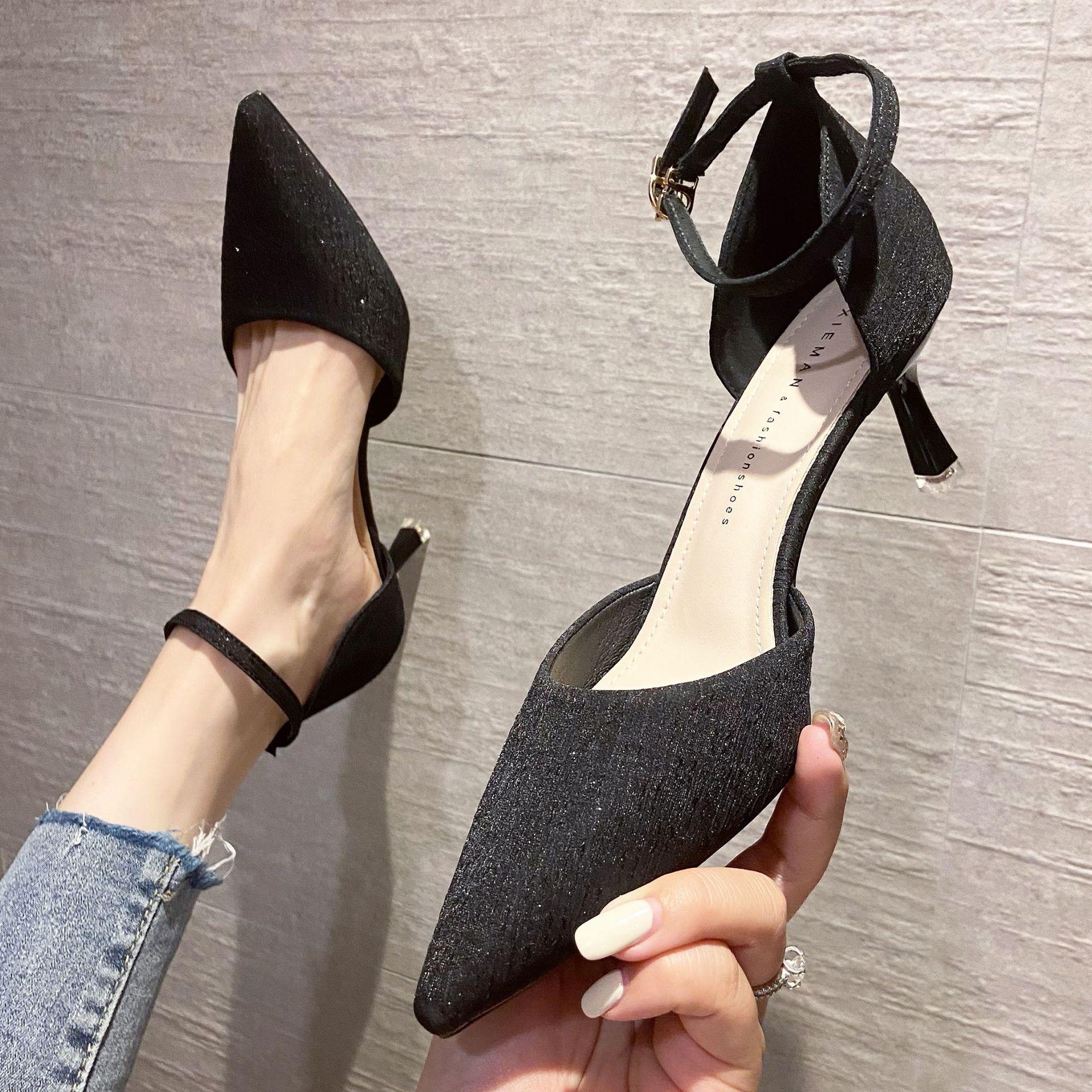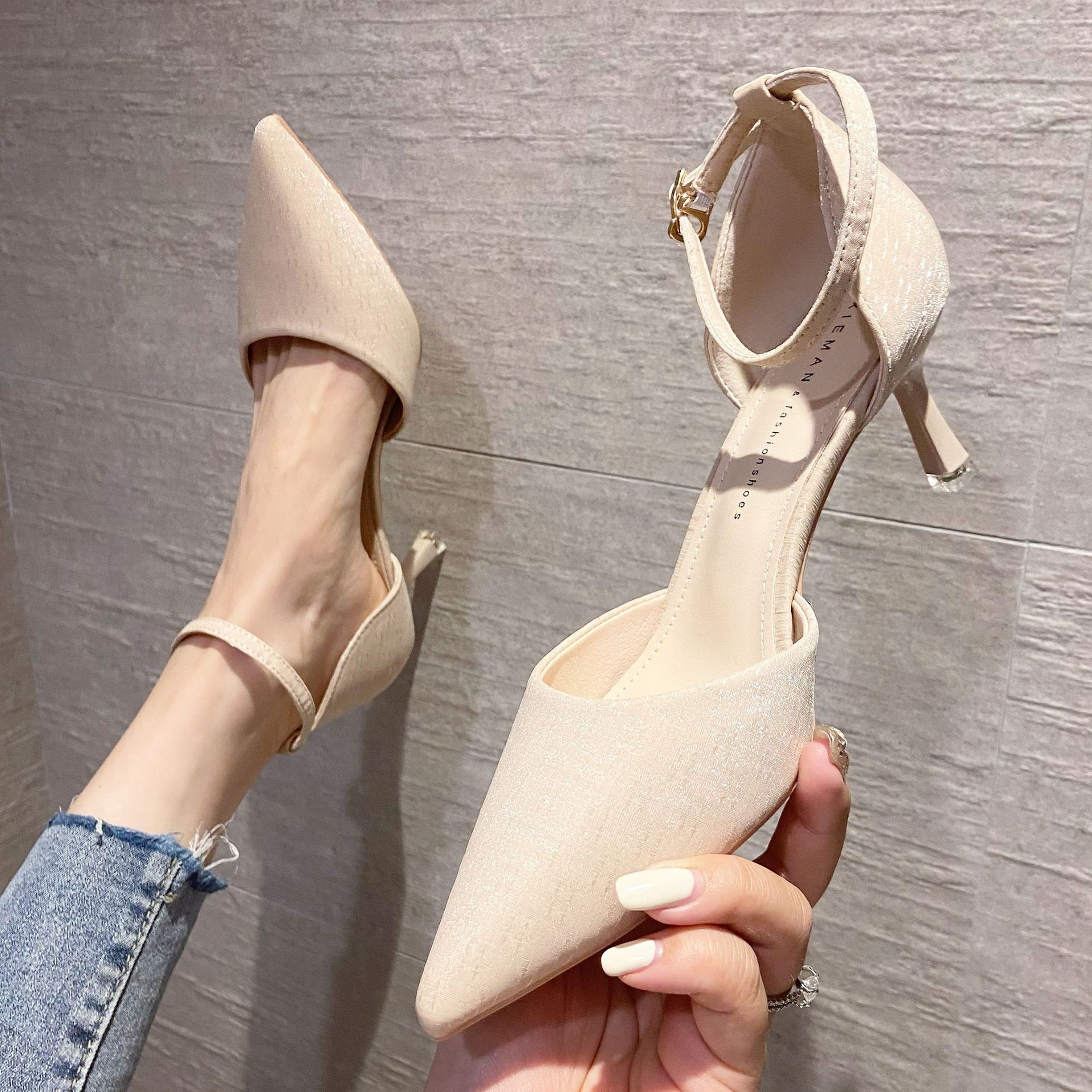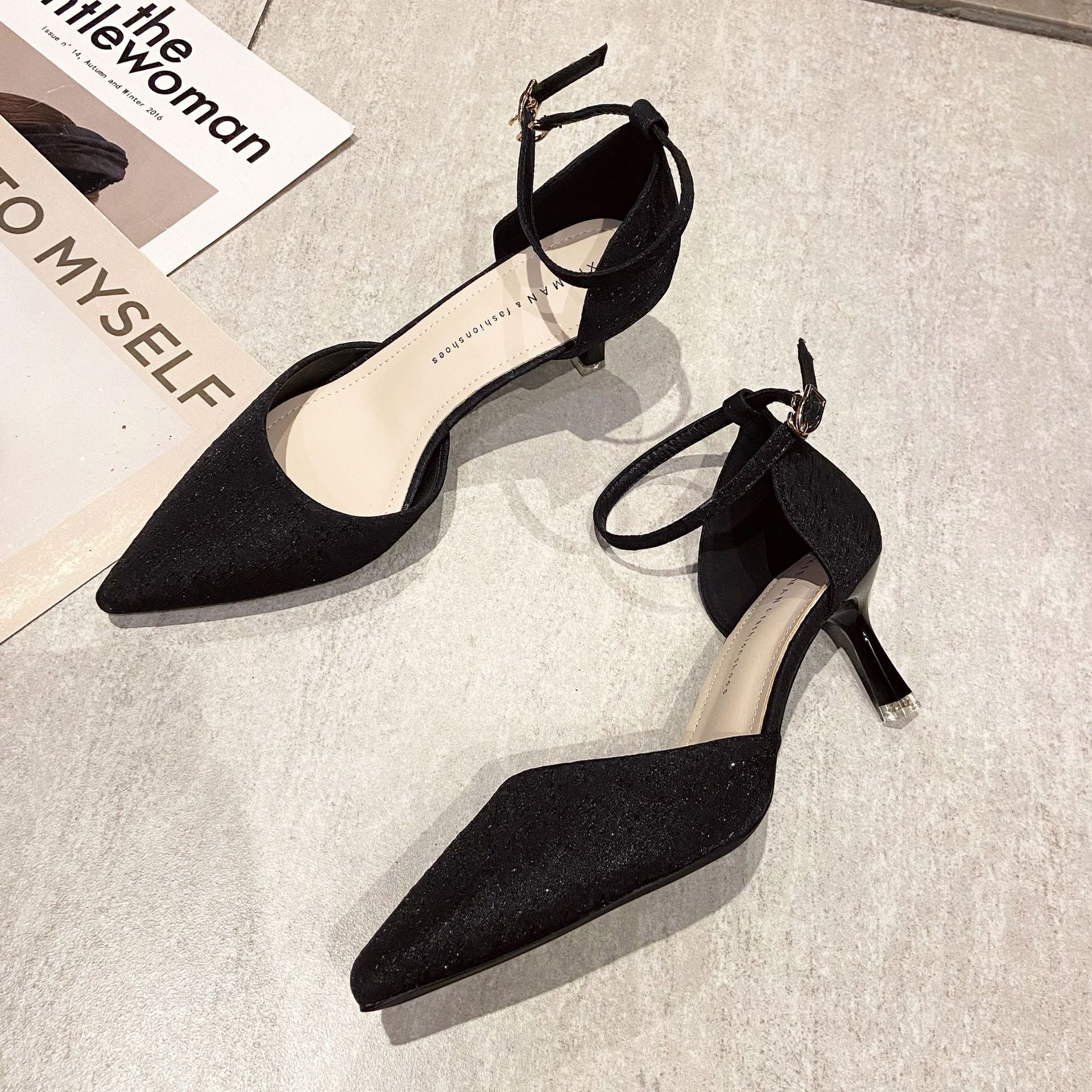 韩版中空鞋绸缎现货舒适内里搭扣橡胶尖头韩版浅口高跟鞋