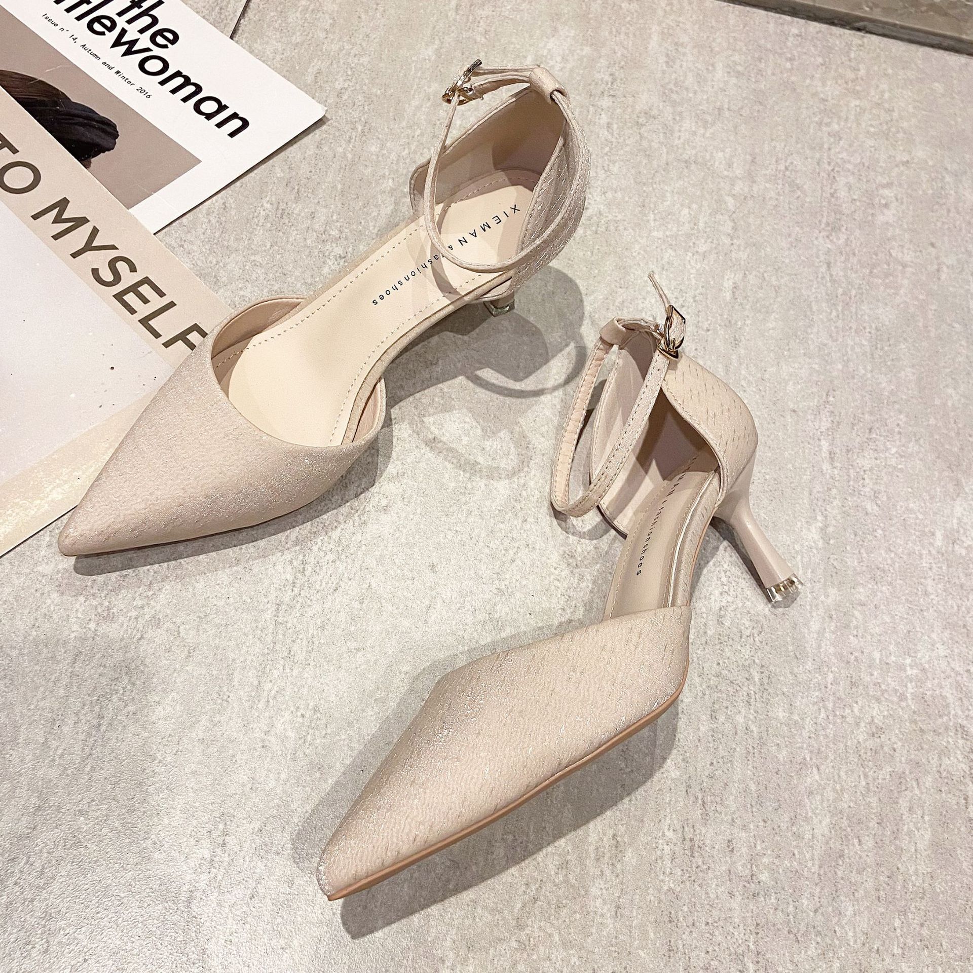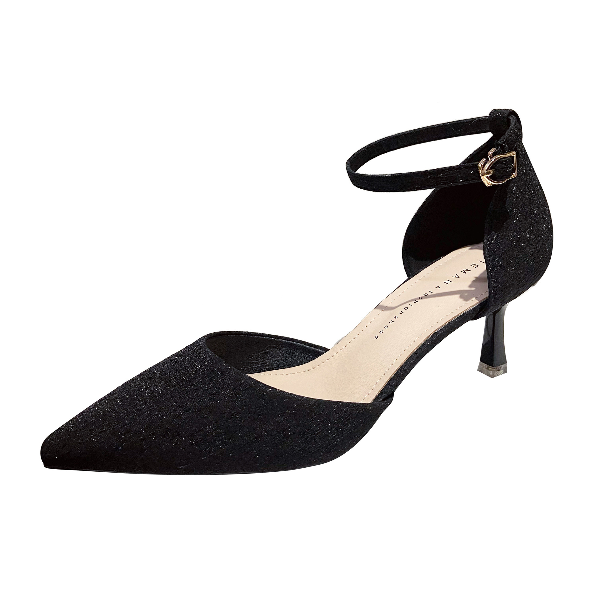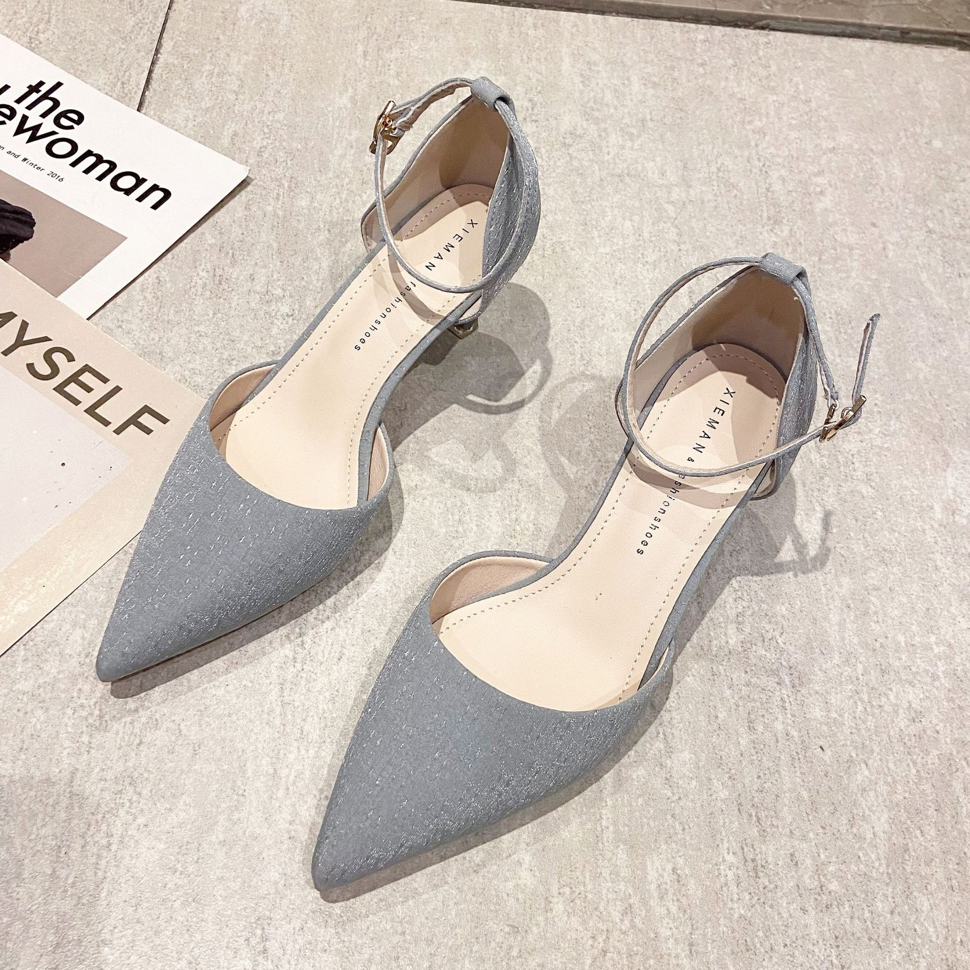 韩版中空鞋绸缎现货舒适内里搭扣橡胶尖头韩版浅口高跟鞋