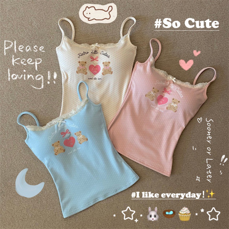 粉色小熊蕾丝边吊带背心女夏季多巴胺少女粉波点带胸垫无袖上衣