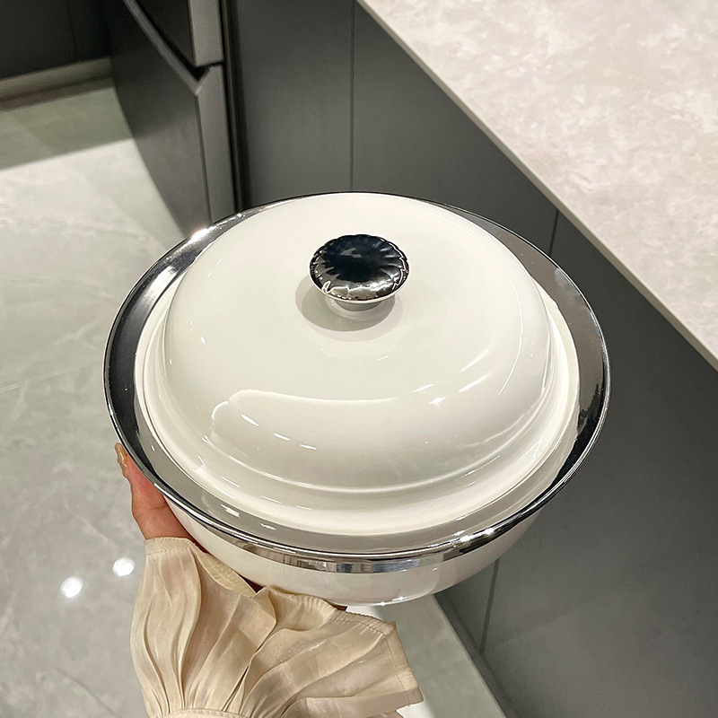 简约ins风高级感汤碗大容量家用带盖陶瓷碗白色电镀银高颜值餐具