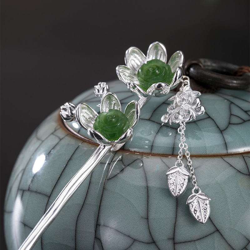 s925银国风复古设计和田碧玉梅花发簪古风汉服花朵步摇钗子