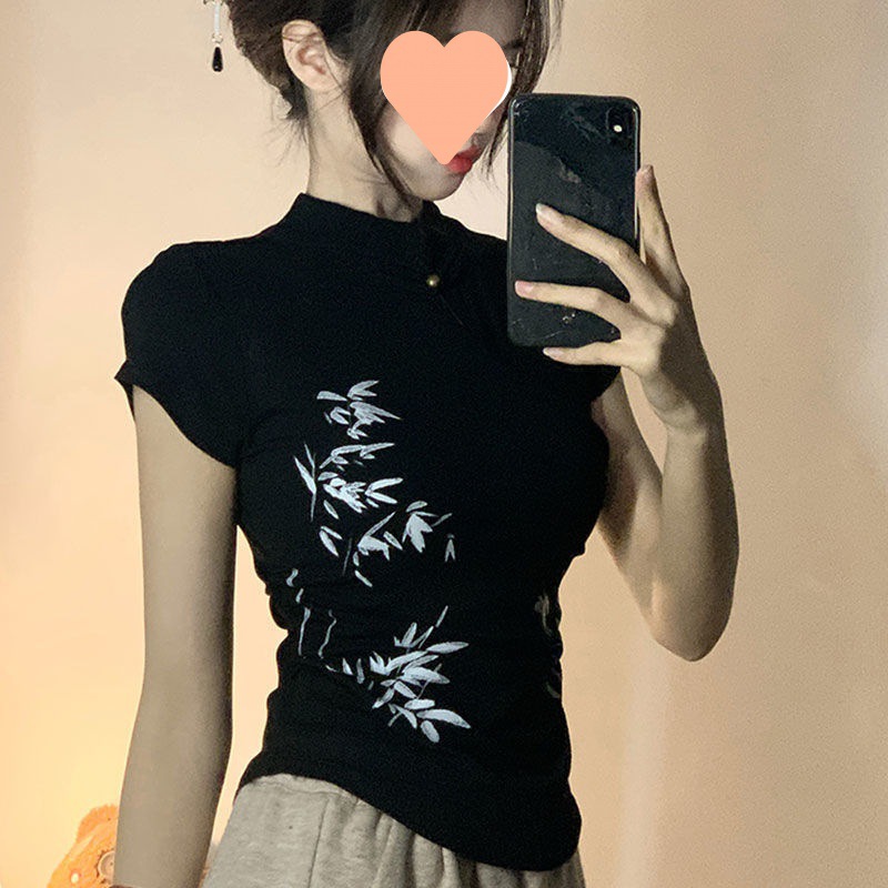 夏季新款纯棉短款短袖T恤女新中式立领修身显瘦百搭国风设计气质