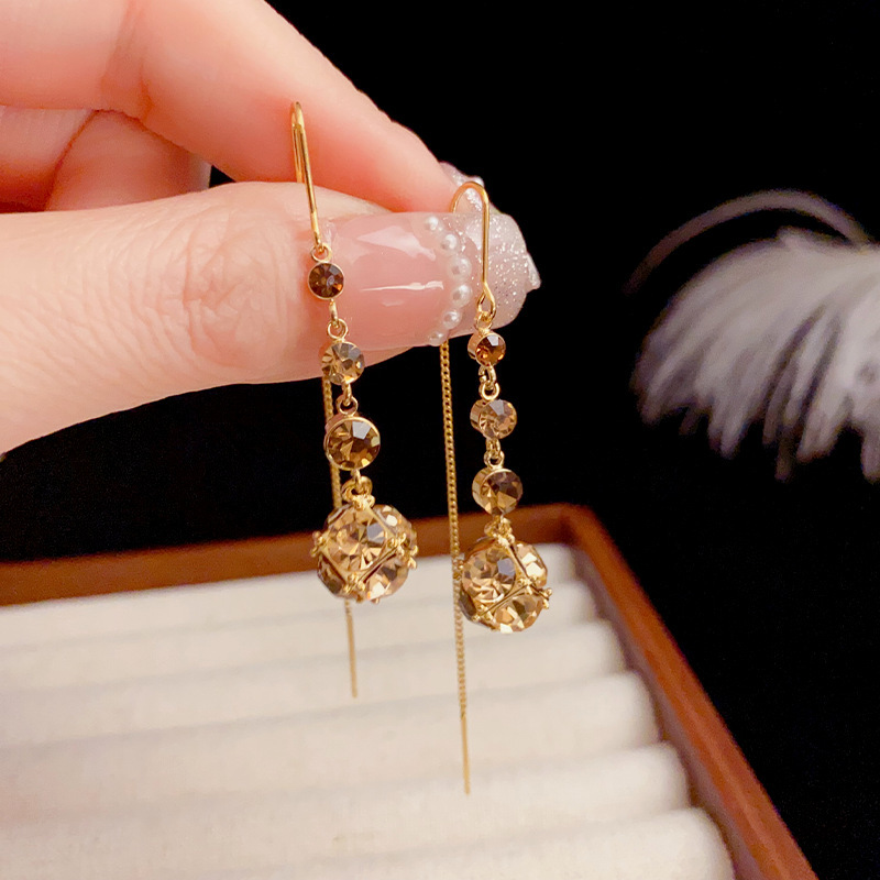 美拉德系列轻奢精致咖色钻球锆石流苏耳线高级感长款耳环气质耳饰
