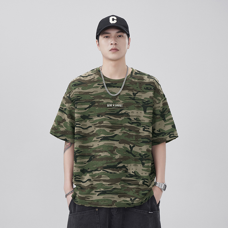 潮牌重磅迷彩破洞短袖T恤男夏季美式潮流印花宽松大码薄款休闲T恤