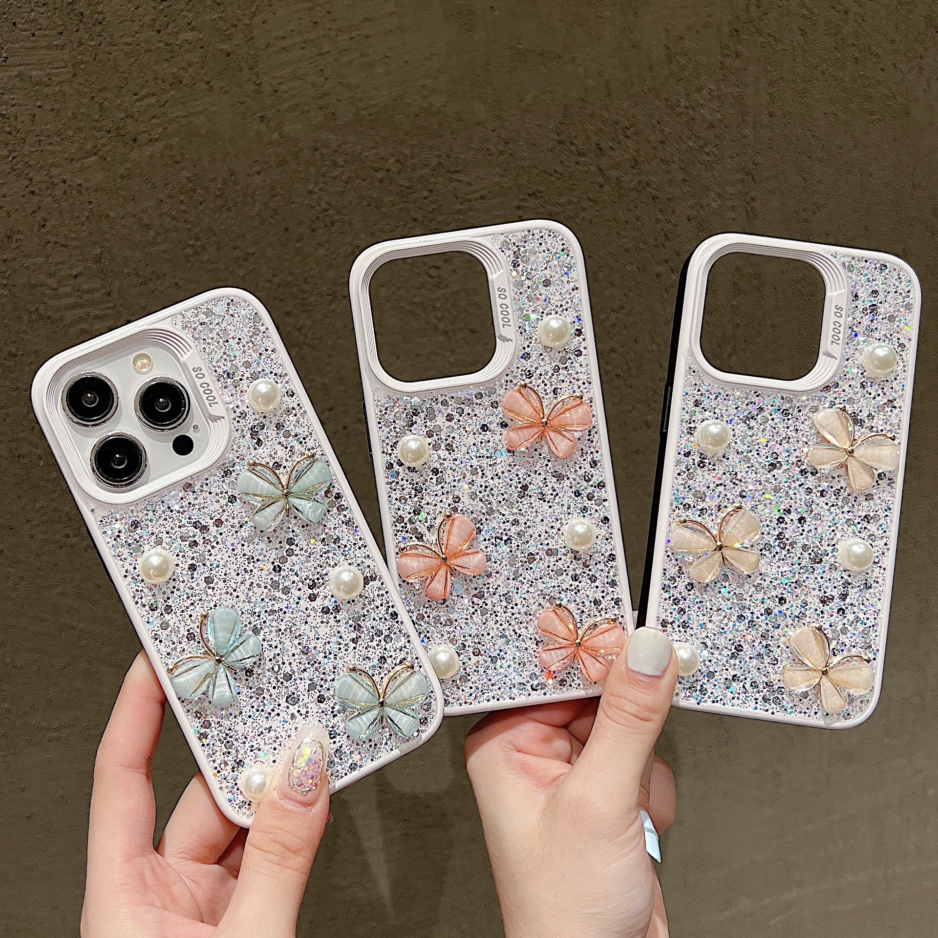 ins高闪立体珍珠蝴蝶适用15Promax手机壳14苹果13防摔12/11滴胶壳
