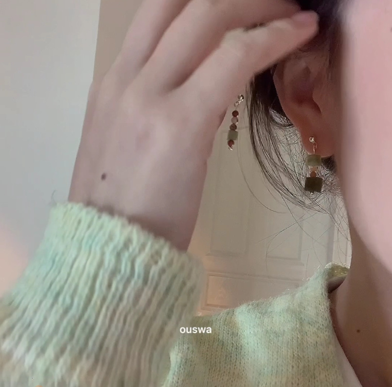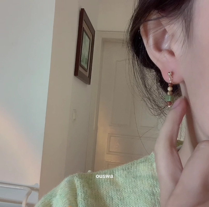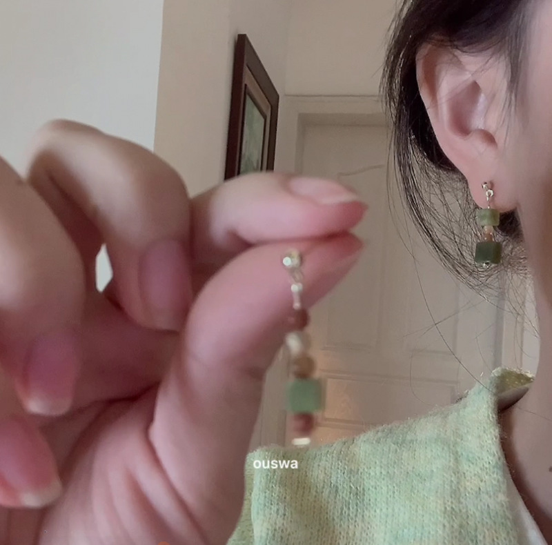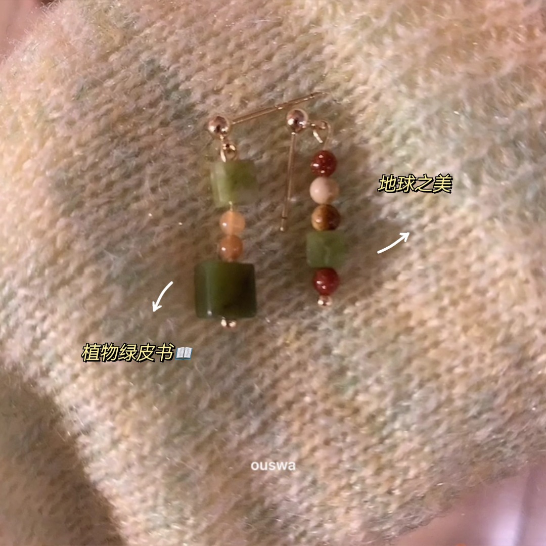 天然原石 手工925银针夹红配绿 古风小众设计高级感玉石小巧耳环