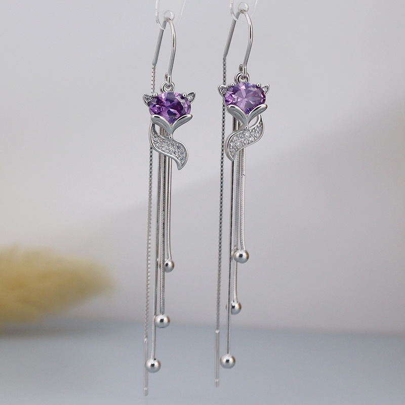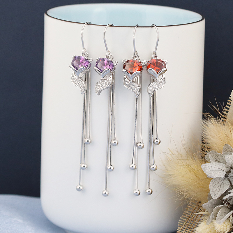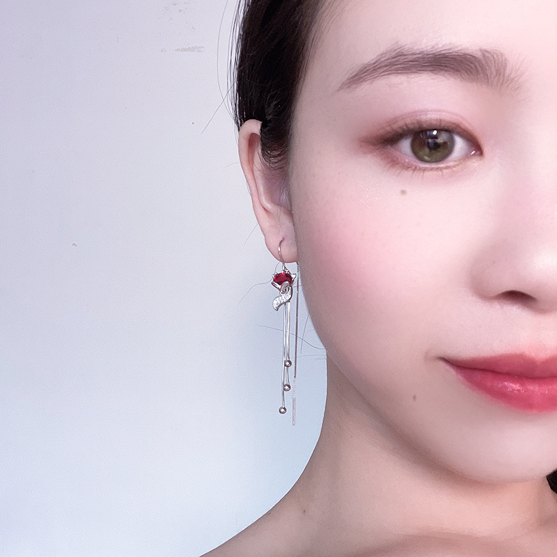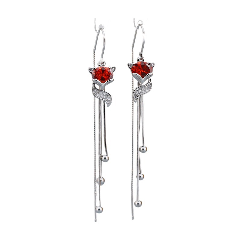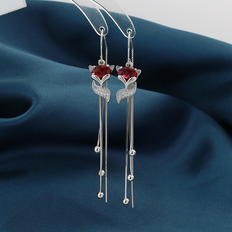 新款S925纯银耳线锆石红色狐狸耳环女韩版潮长款流苏气质百搭耳饰