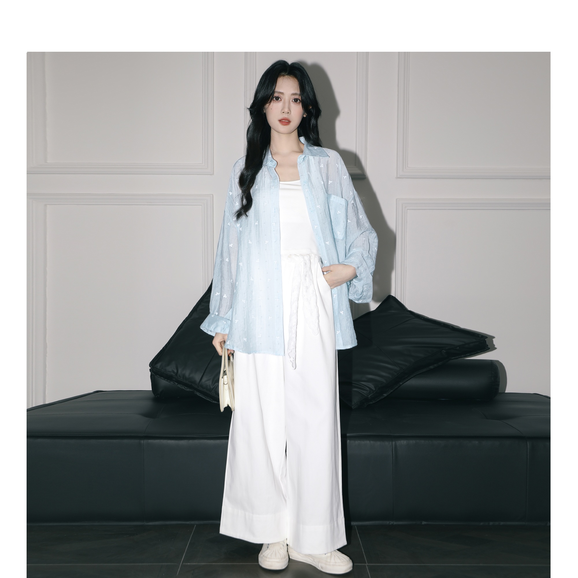 蓝色长袖衬衫外套女春夏2025春新款设计感衬衣外搭防晒衣开衫上衣