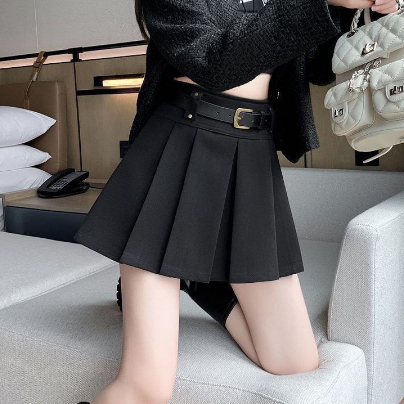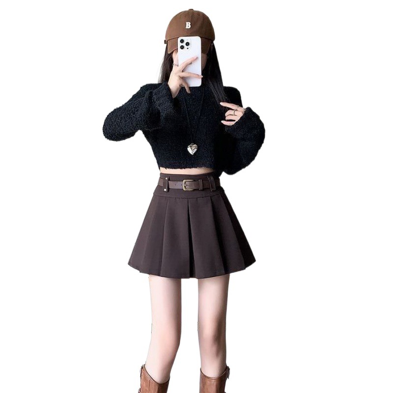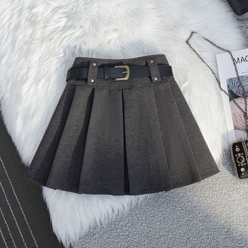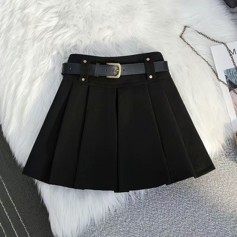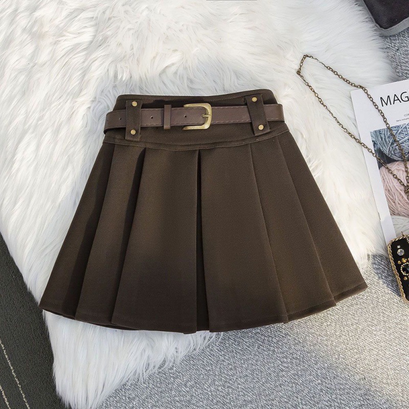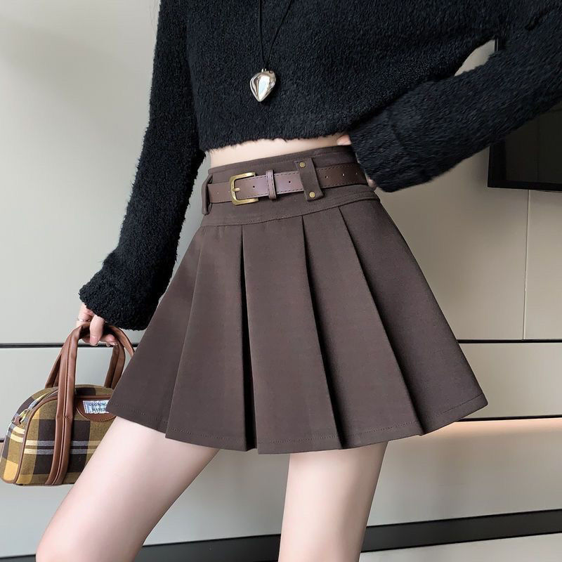 夏季新款高腰半身裙拉德复古咖啡色腰带短裙防走光高腰显瘦百褶裙