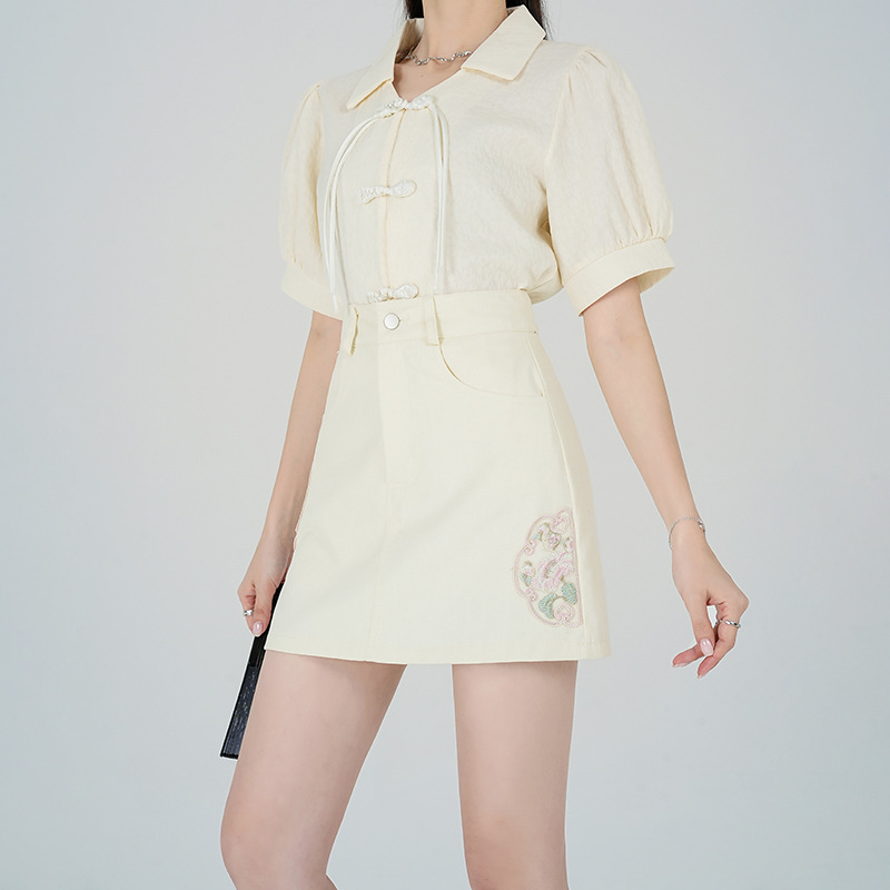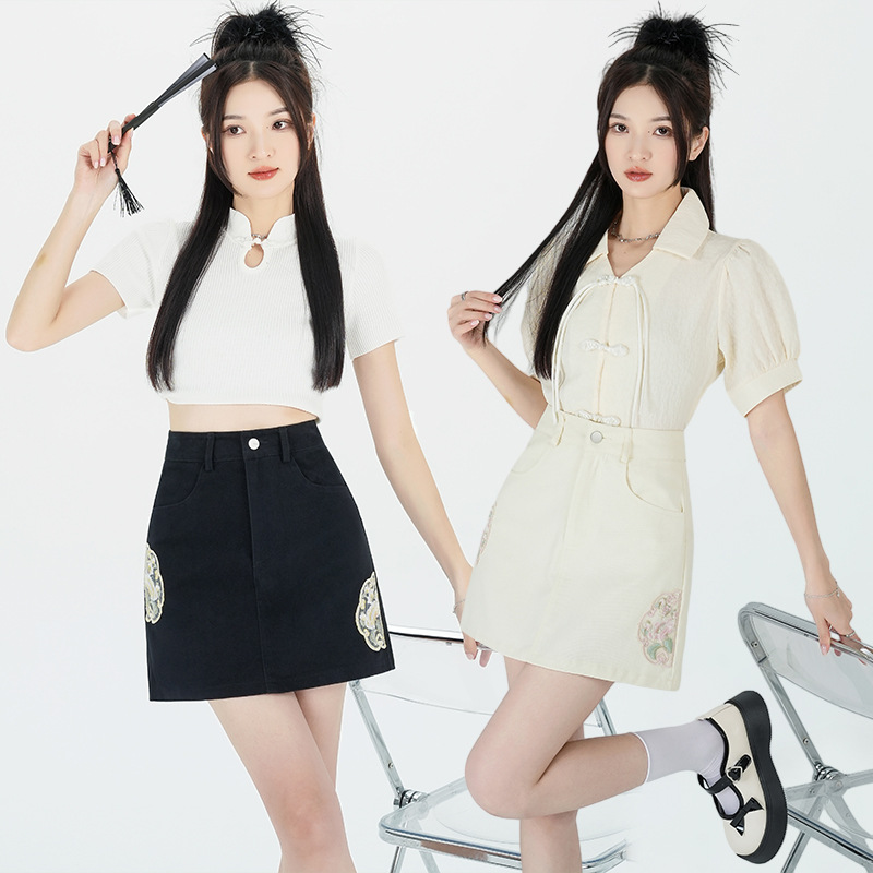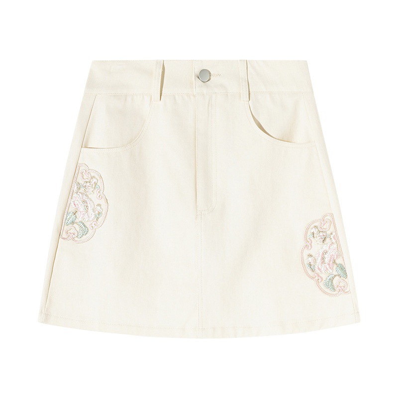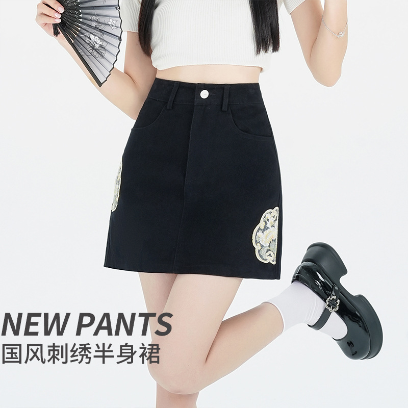 新中式国风刺绣半身裙女春夏新款牛仔A字裙高腰显瘦短裙